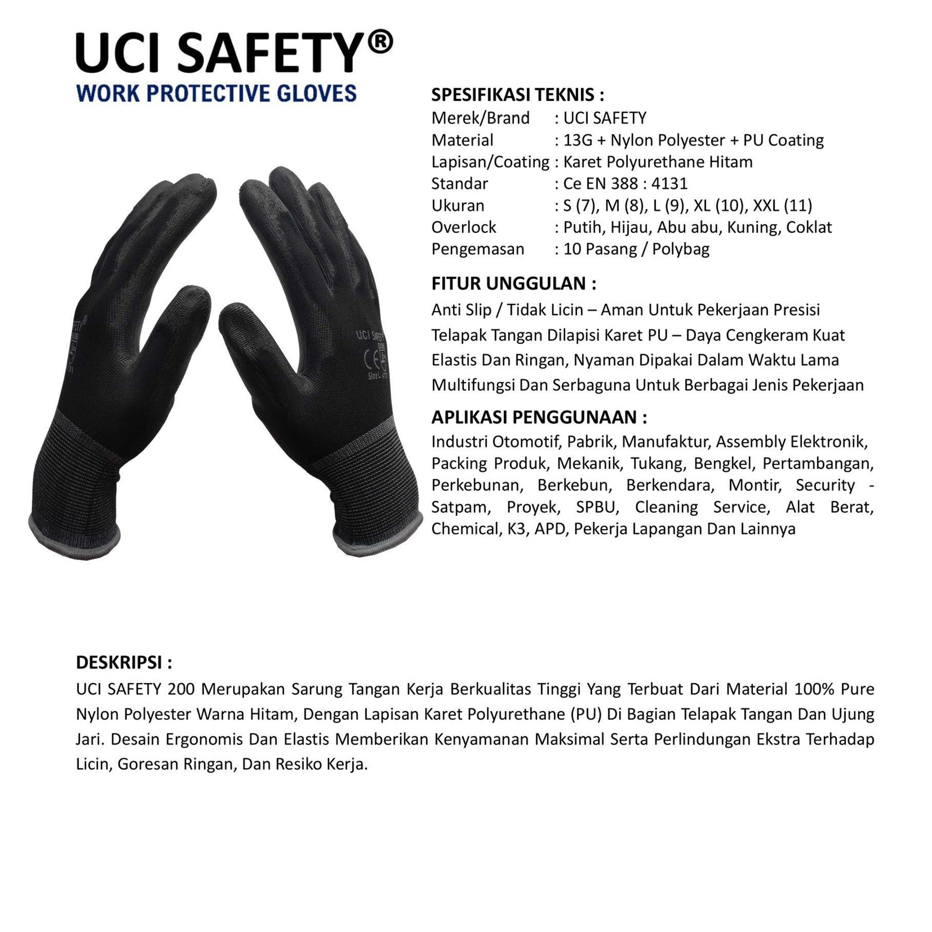 UCI SAFETY 200 Merupakan Sarung Tangan Kerja Berkualitas Tinggi Yang Terbuat Dari Material 100% Pure Nylon Polyester Warna Hitam, Dengan Lapisan Karet Polyurethane (PU) Di Bagian Telapak Tangan Dan Ujung Jari. Desain Ergonomis Dan Elastis Memberikan Kenyamanan Maksimal Serta Perlindungan Ekstra Terhadap Licin, Goresan Ringan, Dan Resiko Kerja.