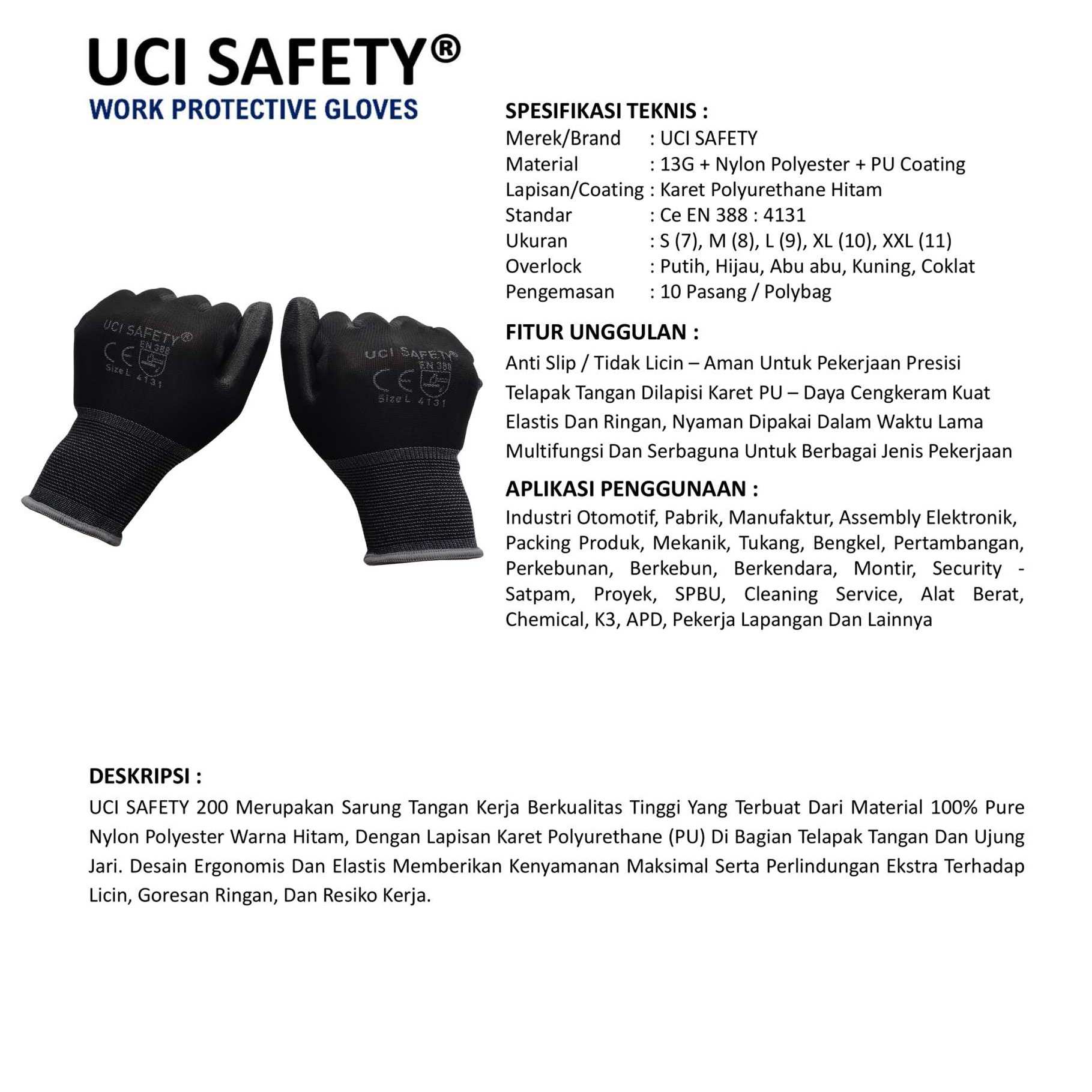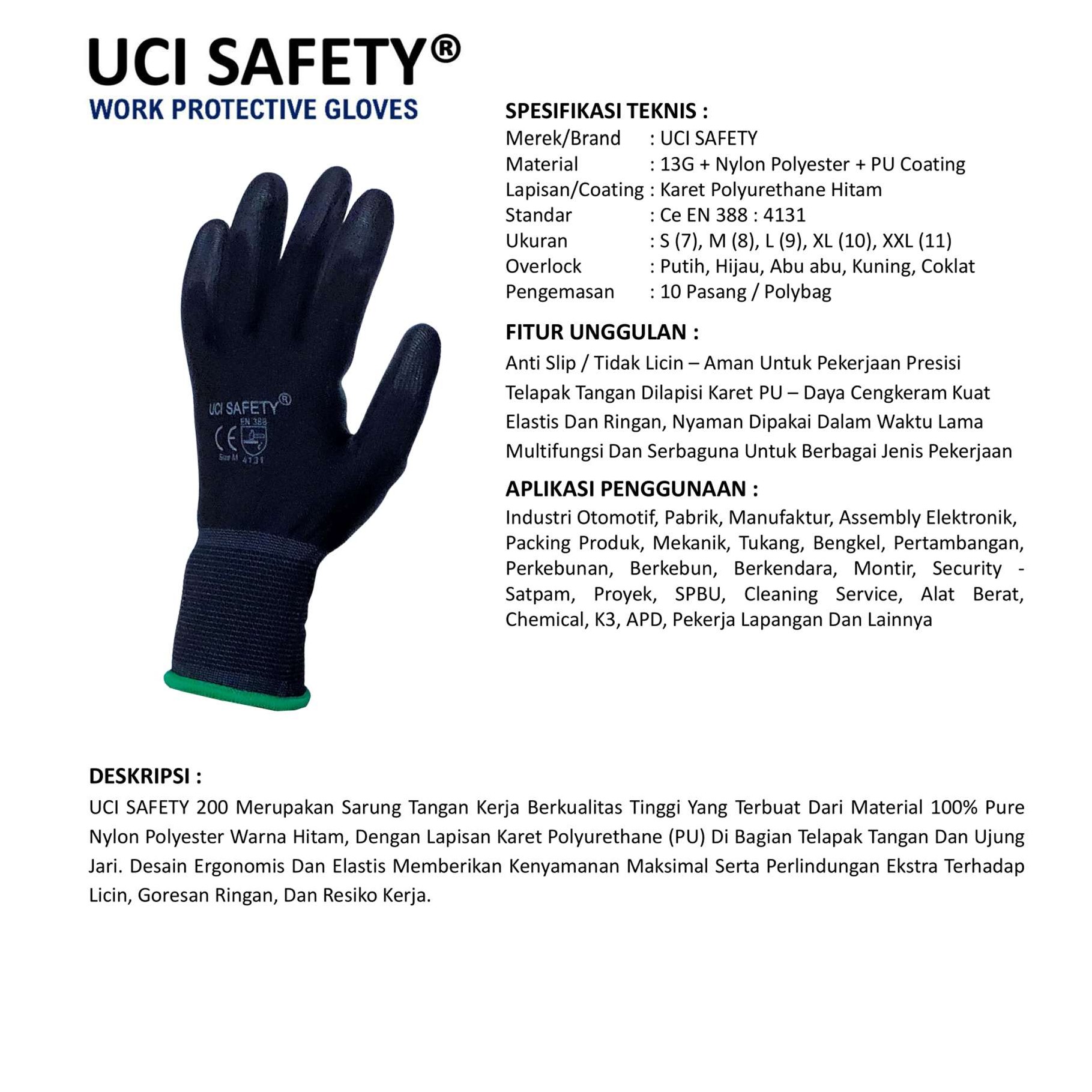 UCI SAFETY 200 Merupakan Sarung Tangan Kerja Berkualitas Tinggi Yang Terbuat Dari Material 100% Pure Nylon Polyester Warna Hitam, Dengan Lapisan Karet Polyurethane (PU) Di Bagian Telapak Tangan Dan Ujung Jari. Desain Ergonomis Dan Elastis Memberikan Kenyamanan Maksimal Serta Perlindungan Ekstra Terhadap Licin, Goresan Ringan, Dan Resiko Kerja.