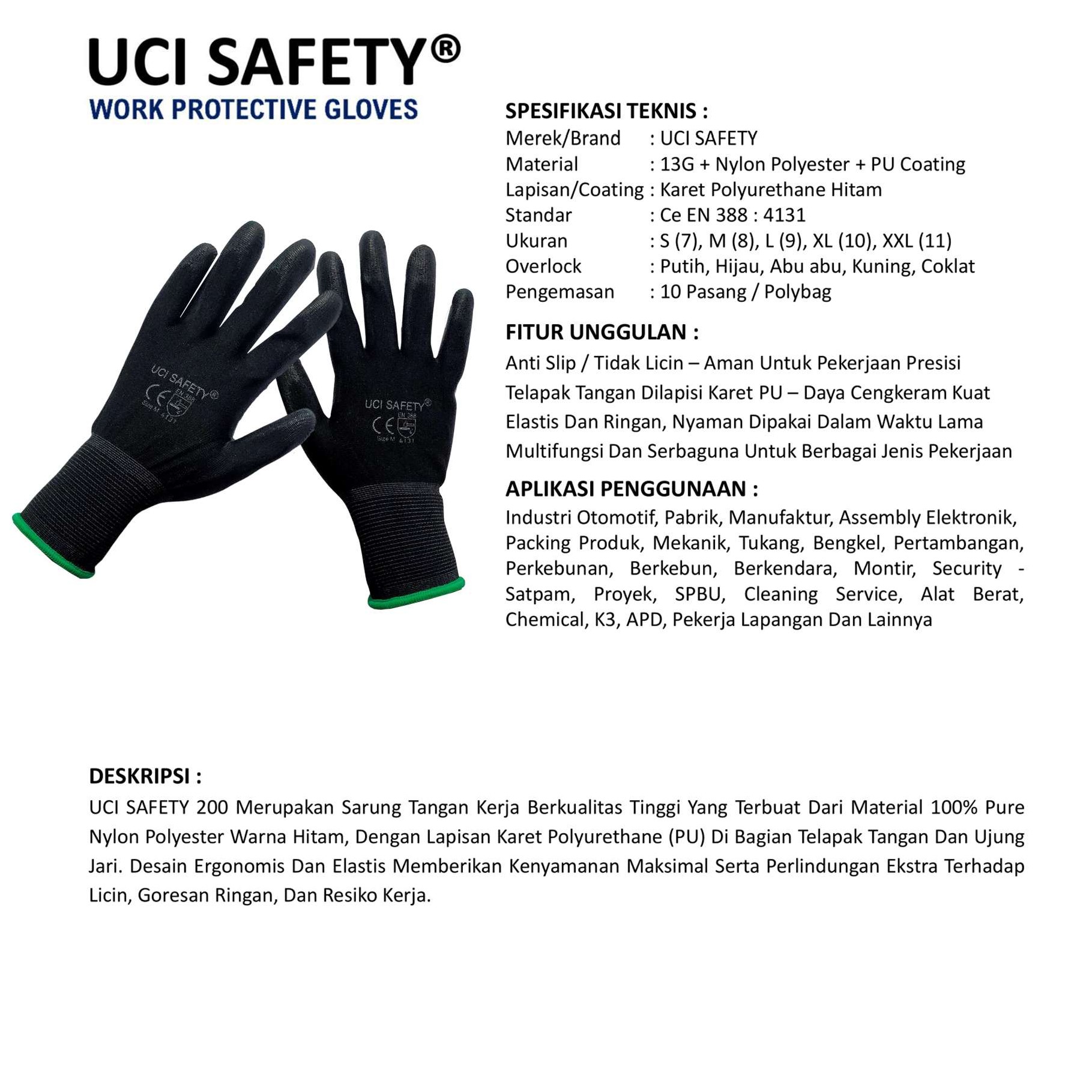 UCI SAFETY 200 Merupakan Sarung Tangan Kerja Berkualitas Tinggi Yang Terbuat Dari Material 100% Pure Nylon Polyester Warna Hitam, Dengan Lapisan Karet Polyurethane (PU) Di Bagian Telapak Tangan Dan Ujung Jari. Desain Ergonomis Dan Elastis Memberikan Kenyamanan Maksimal Serta Perlindungan Ekstra Terhadap Licin, Goresan Ringan, Dan Resiko Kerja.