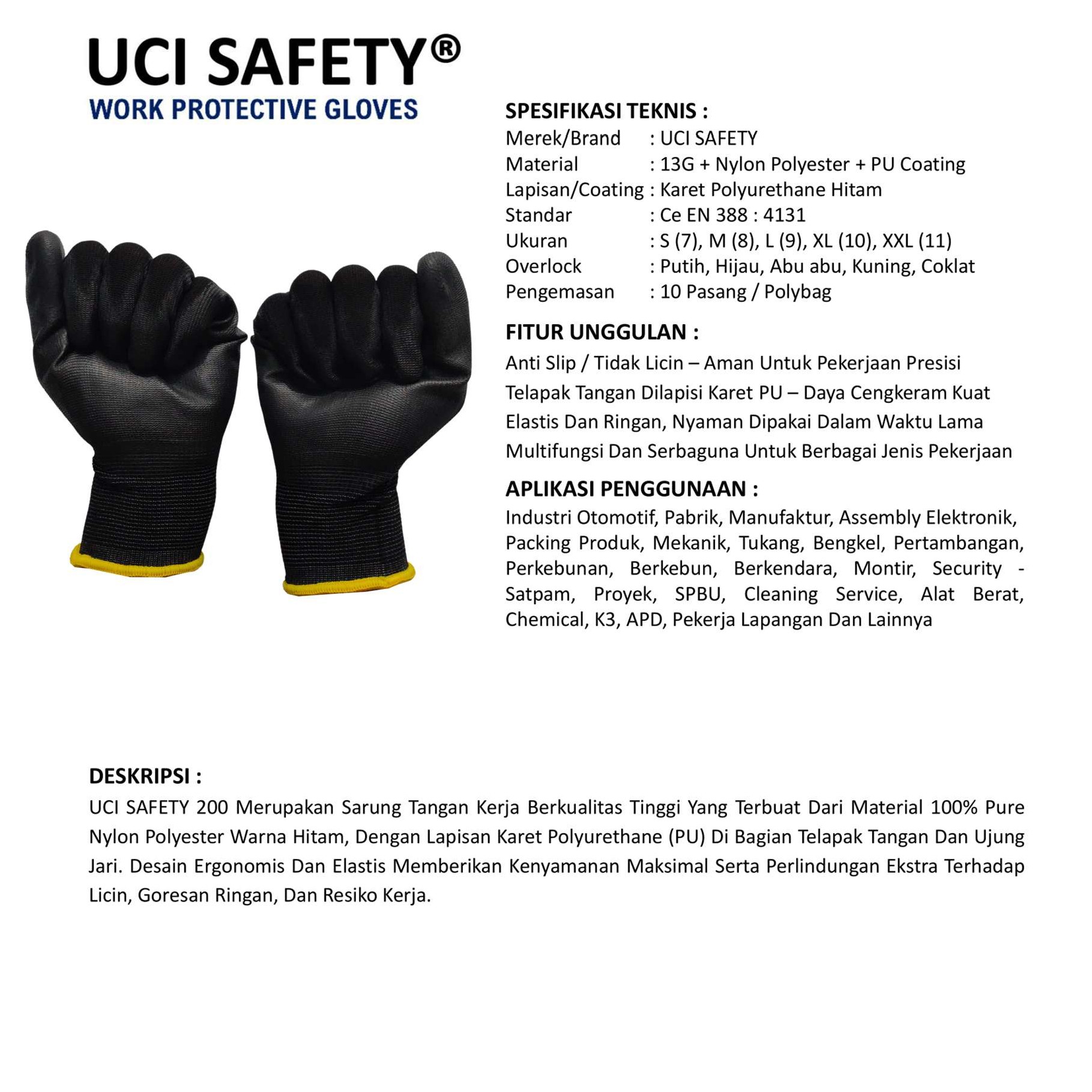 UCI SAFETY 200 Merupakan Sarung Tangan Kerja Berkualitas Tinggi Yang Terbuat Dari Material 100% Pure Nylon Polyester Warna Hitam, Dengan Lapisan Karet Polyurethane (PU) Di Bagian Telapak Tangan Dan Ujung Jari. Desain Ergonomis Dan Elastis Memberikan Kenyamanan Maksimal Serta Perlindungan Ekstra Terhadap Licin, Goresan Ringan, Dan Resiko Kerja.