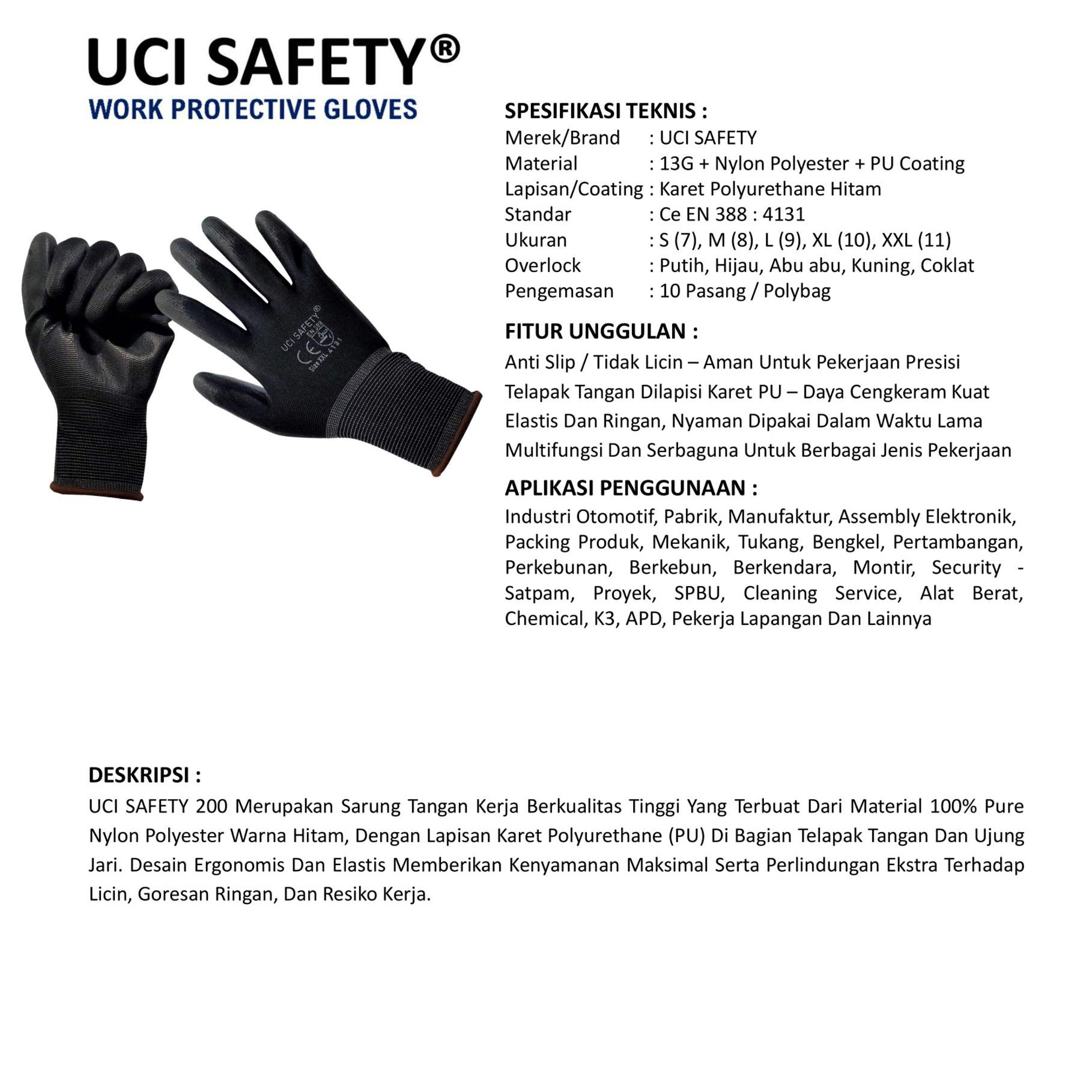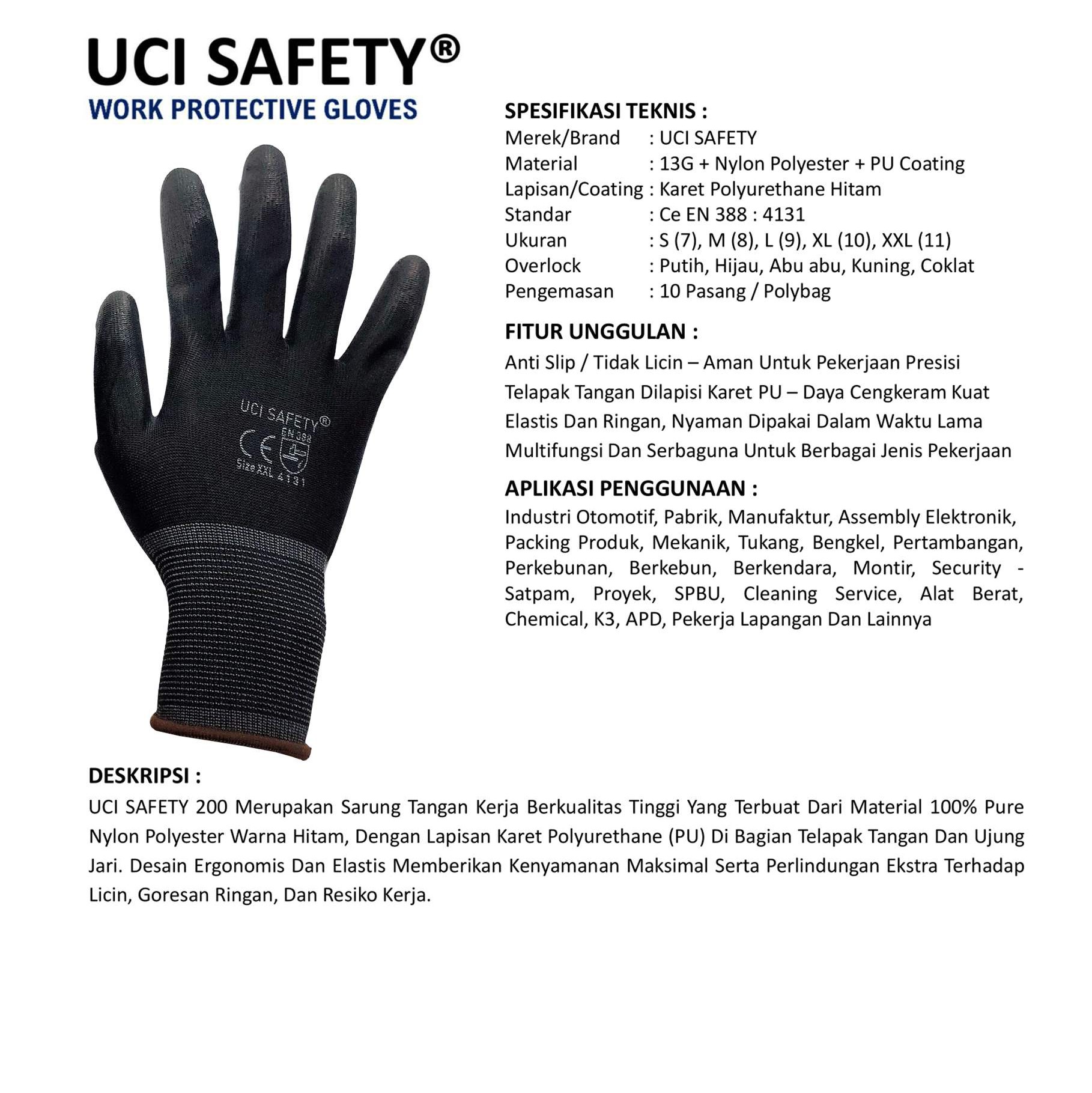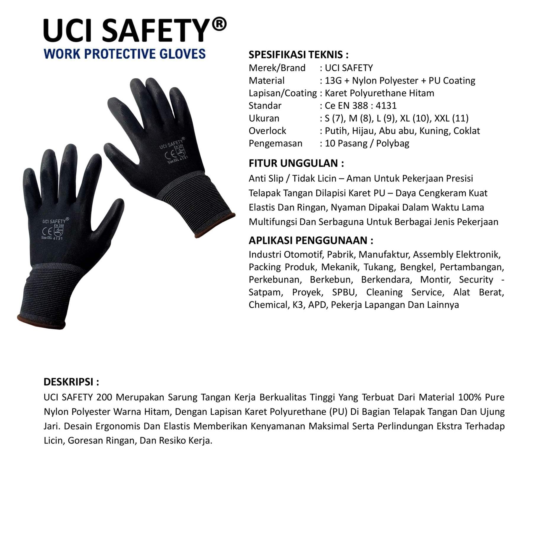 UCI SAFETY 200 Merupakan Sarung Tangan Kerja Berkualitas Tinggi Yang Terbuat Dari Material 100% Pure Nylon Polyester Warna Hitam, Dengan Lapisan Karet Polyurethane (PU) Di Bagian Telapak Tangan Dan Ujung Jari. Desain Ergonomis Dan Elastis Memberikan Kenyamanan Maksimal Serta Perlindungan Ekstra Terhadap Licin, Goresan Ringan, Dan Resiko Kerja.