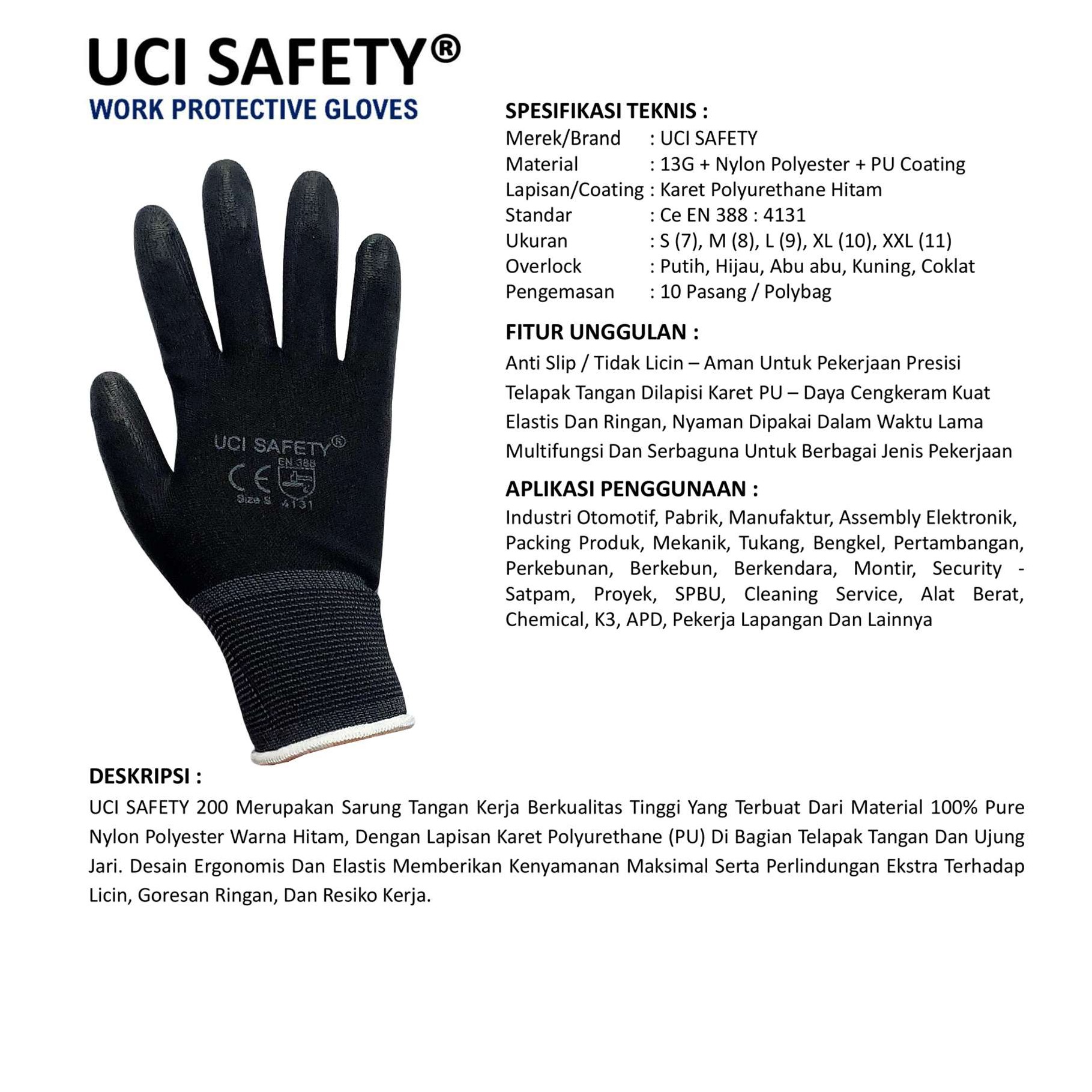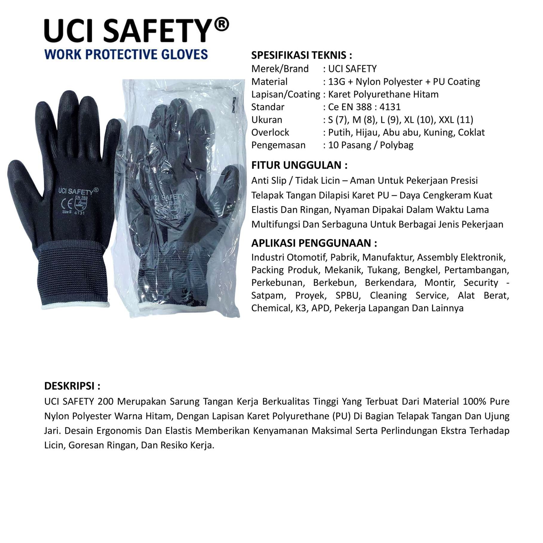 UCI SAFETY 200 Merupakan Sarung Tangan Kerja Berkualitas Tinggi Yang Terbuat Dari Material 100% Pure Nylon Polyester Warna Hitam, Dengan Lapisan Karet Polyurethane (PU) Di Bagian Telapak Tangan Dan Ujung Jari. Desain Ergonomis Dan Elastis Memberikan Kenyamanan Maksimal Serta Perlindungan Ekstra Terhadap Licin, Goresan Ringan, Dan Resiko Kerja.