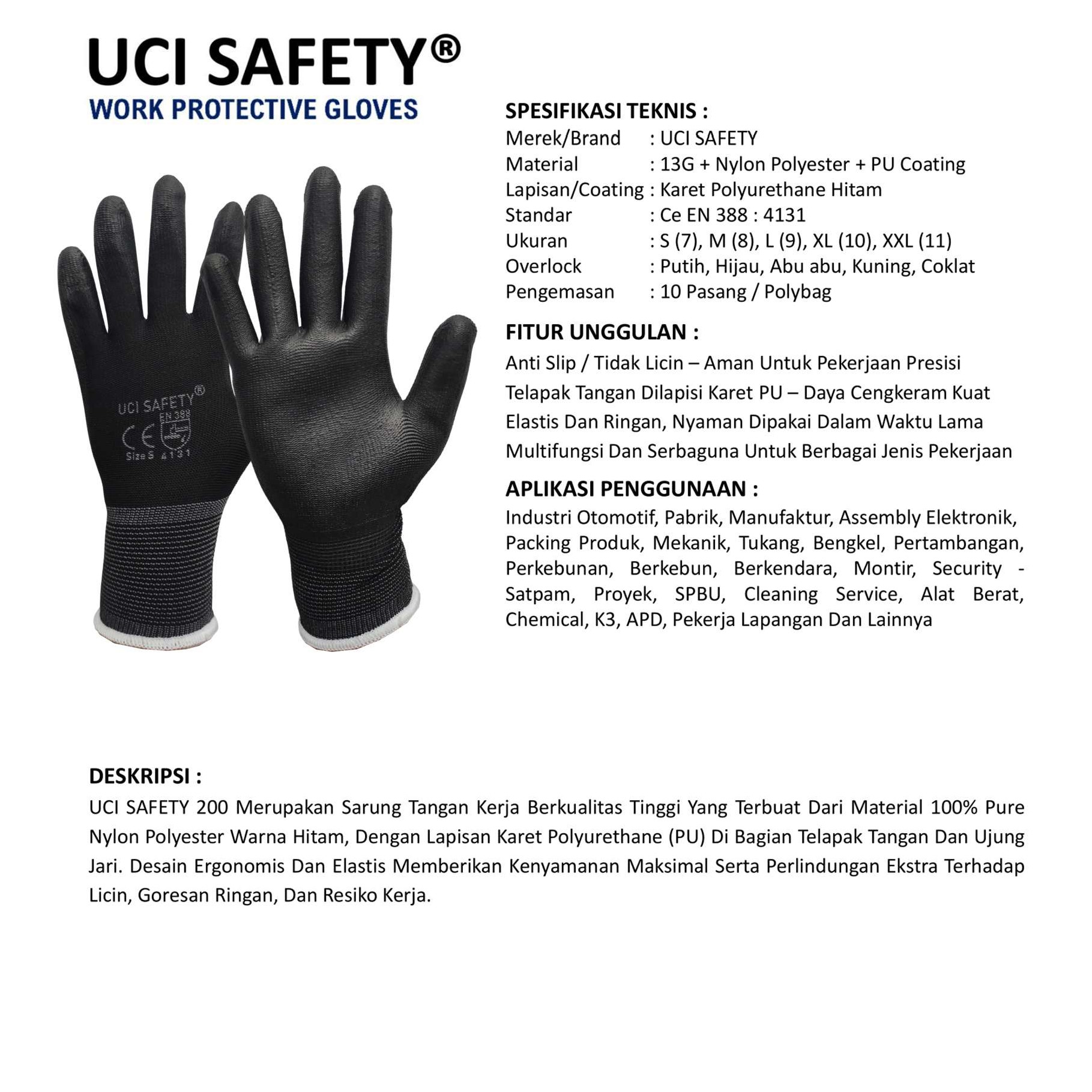 UCI SAFETY 200 Merupakan Sarung Tangan Kerja Berkualitas Tinggi Yang Terbuat Dari Material 100% Pure Nylon Polyester Warna Hitam, Dengan Lapisan Karet Polyurethane (PU) Di Bagian Telapak Tangan Dan Ujung Jari. Desain Ergonomis Dan Elastis Memberikan Kenyamanan Maksimal Serta Perlindungan Ekstra Terhadap Licin, Goresan Ringan, Dan Resiko Kerja.