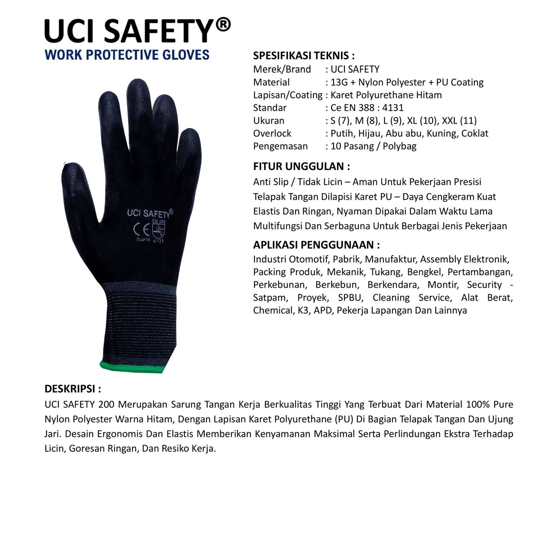 UCI SAFETY 200 Merupakan Sarung Tangan Kerja Berkualitas Tinggi Yang Terbuat Dari Material 100% Pure Nylon Polyester Warna Hitam, Dengan Lapisan Karet Polyurethane (PU) Di Bagian Telapak Tangan Dan Ujung Jari. Desain Ergonomis Dan Elastis Memberikan Kenyamanan Maksimal Serta Perlindungan Ekstra Terhadap Licin, Goresan Ringan, Dan Resiko Kerja.