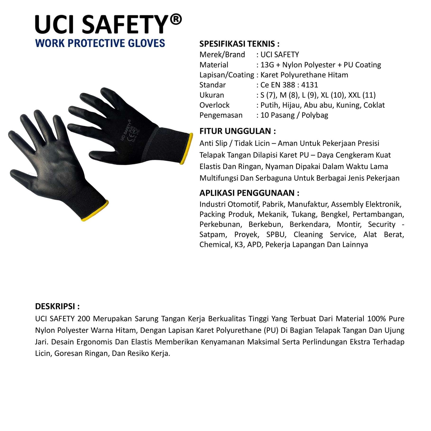 UCI SAFETY 200 Merupakan Sarung Tangan Kerja Berkualitas Tinggi Yang Terbuat Dari Material 100% Pure Nylon Polyester Warna Hitam, Dengan Lapisan Karet Polyurethane (PU) Di Bagian Telapak Tangan Dan Ujung Jari. Desain Ergonomis Dan Elastis Memberikan Kenyamanan Maksimal Serta Perlindungan Ekstra Terhadap Licin, Goresan Ringan, Dan Resiko Kerja.