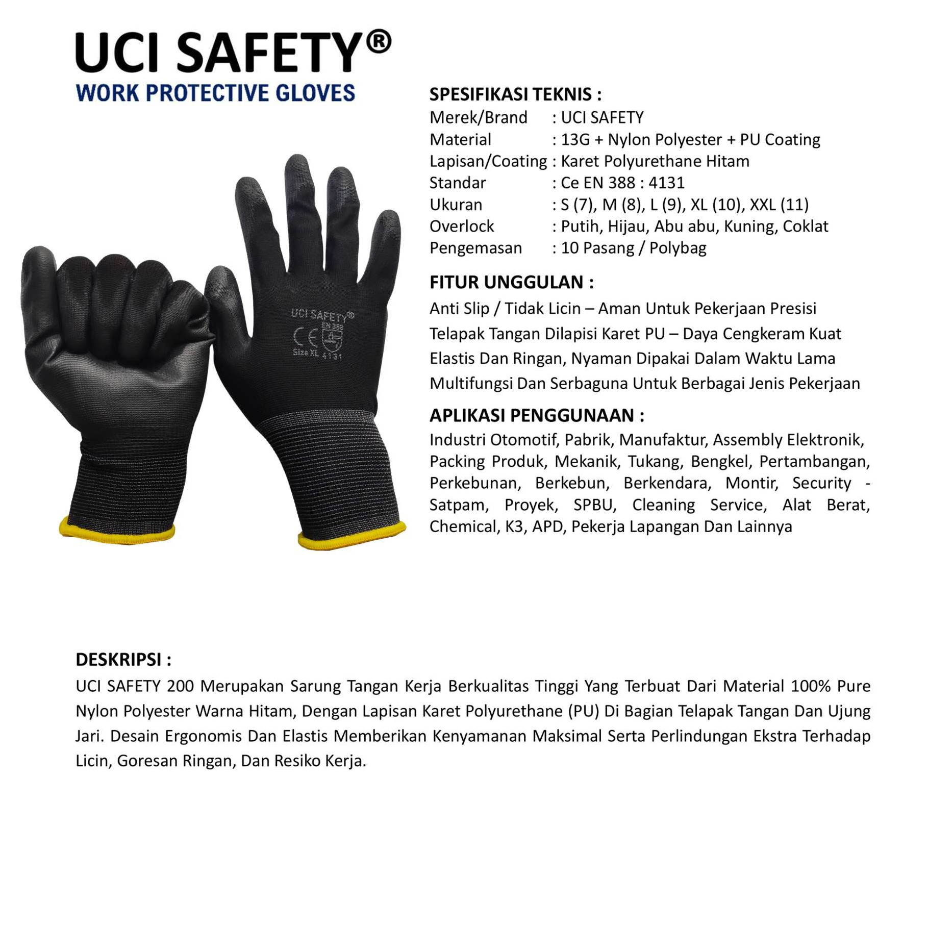 UCI SAFETY 200 Merupakan Sarung Tangan Kerja Berkualitas Tinggi Yang Terbuat Dari Material 100% Pure Nylon Polyester Warna Hitam, Dengan Lapisan Karet Polyurethane (PU) Di Bagian Telapak Tangan Dan Ujung Jari. Desain Ergonomis Dan Elastis Memberikan Kenyamanan Maksimal Serta Perlindungan Ekstra Terhadap Licin, Goresan Ringan, Dan Resiko Kerja.