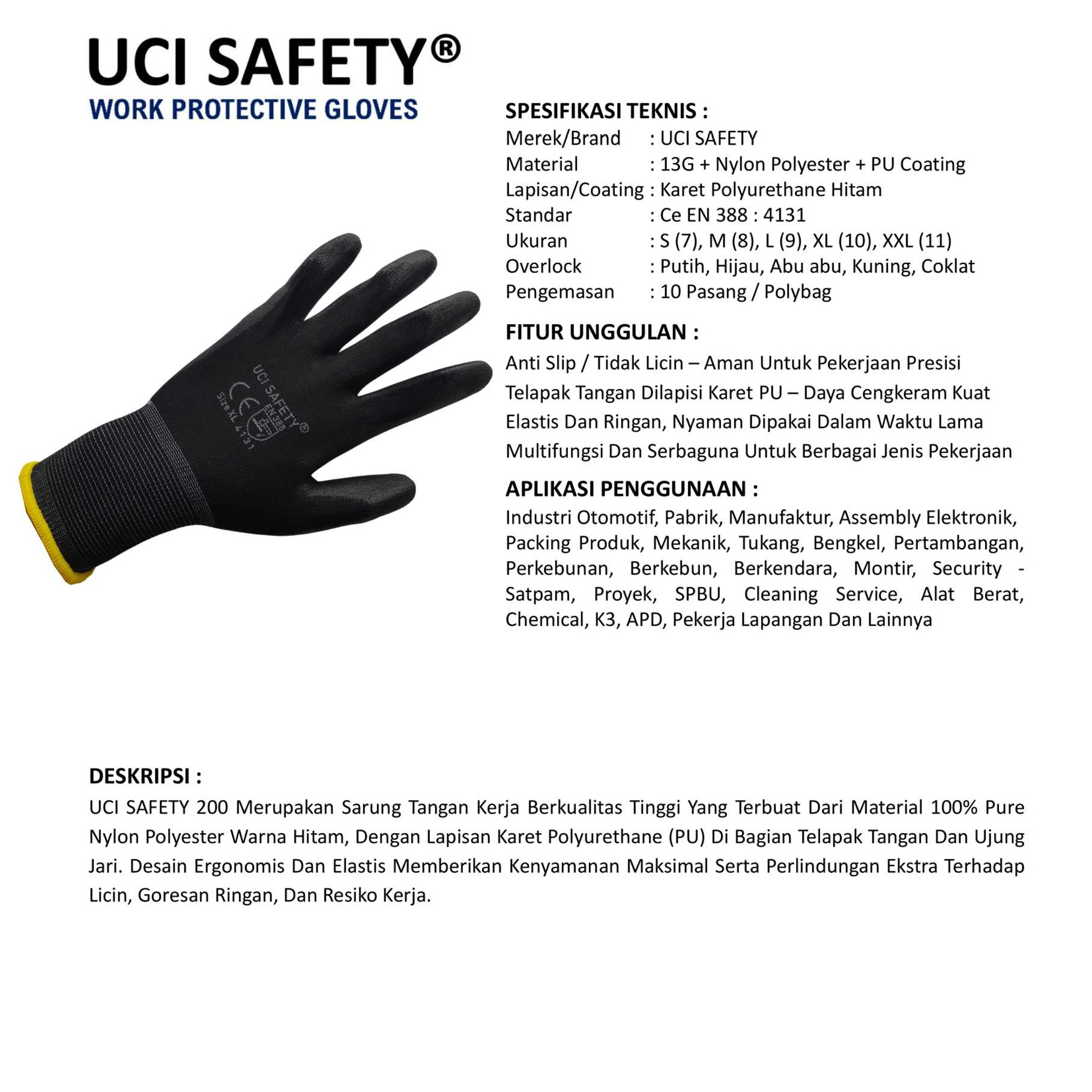 UCI SAFETY 200 Merupakan Sarung Tangan Kerja Berkualitas Tinggi Yang Terbuat Dari Material 100% Pure Nylon Polyester Warna Hitam, Dengan Lapisan Karet Polyurethane (PU) Di Bagian Telapak Tangan Dan Ujung Jari. Desain Ergonomis Dan Elastis Memberikan Kenyamanan Maksimal Serta Perlindungan Ekstra Terhadap Licin, Goresan Ringan, Dan Resiko Kerja.