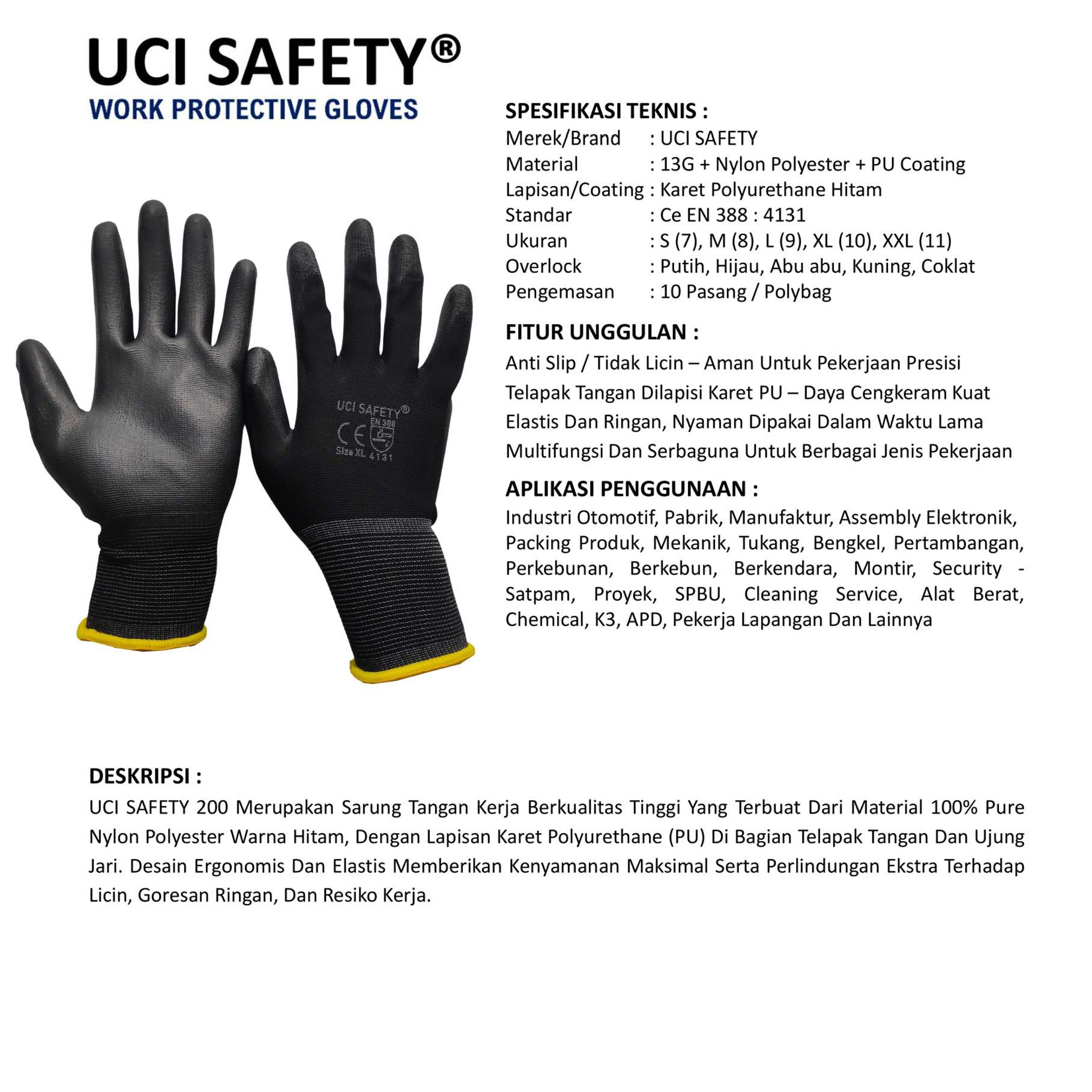 UCI SAFETY 200 Merupakan Sarung Tangan Kerja Berkualitas Tinggi Yang Terbuat Dari Material 100% Pure Nylon Polyester Warna Hitam, Dengan Lapisan Karet Polyurethane (PU) Di Bagian Telapak Tangan Dan Ujung Jari. Desain Ergonomis Dan Elastis Memberikan Kenyamanan Maksimal Serta Perlindungan Ekstra Terhadap Licin, Goresan Ringan, Dan Resiko Kerja.