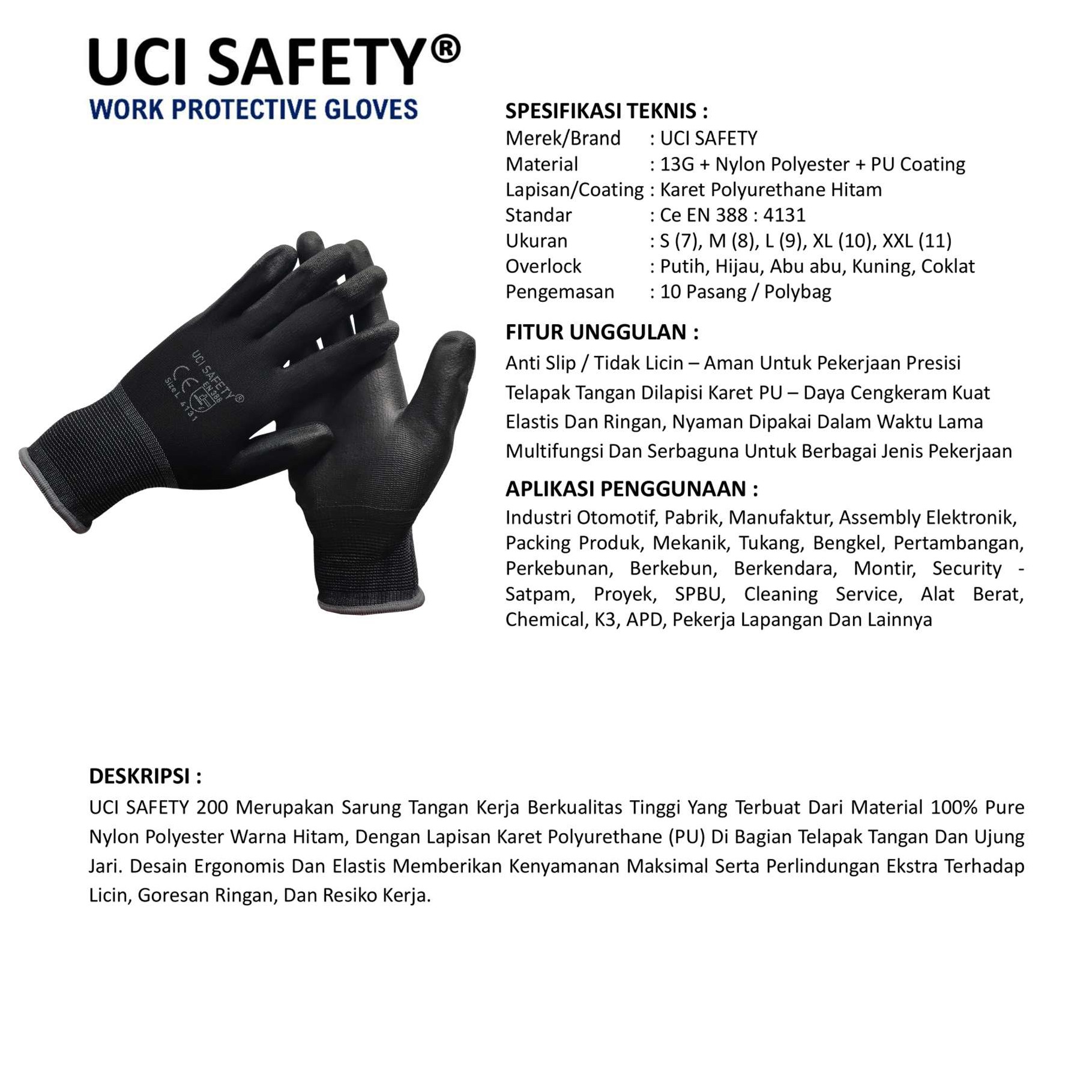 UCI SAFETY 200 Merupakan Sarung Tangan Kerja Berkualitas Tinggi Yang Terbuat Dari Material 100% Pure Nylon Polyester Warna Hitam, Dengan Lapisan Karet Polyurethane (PU) Di Bagian Telapak Tangan Dan Ujung Jari. Desain Ergonomis Dan Elastis Memberikan Kenyamanan Maksimal Serta Perlindungan Ekstra Terhadap Licin, Goresan Ringan, Dan Resiko Kerja.