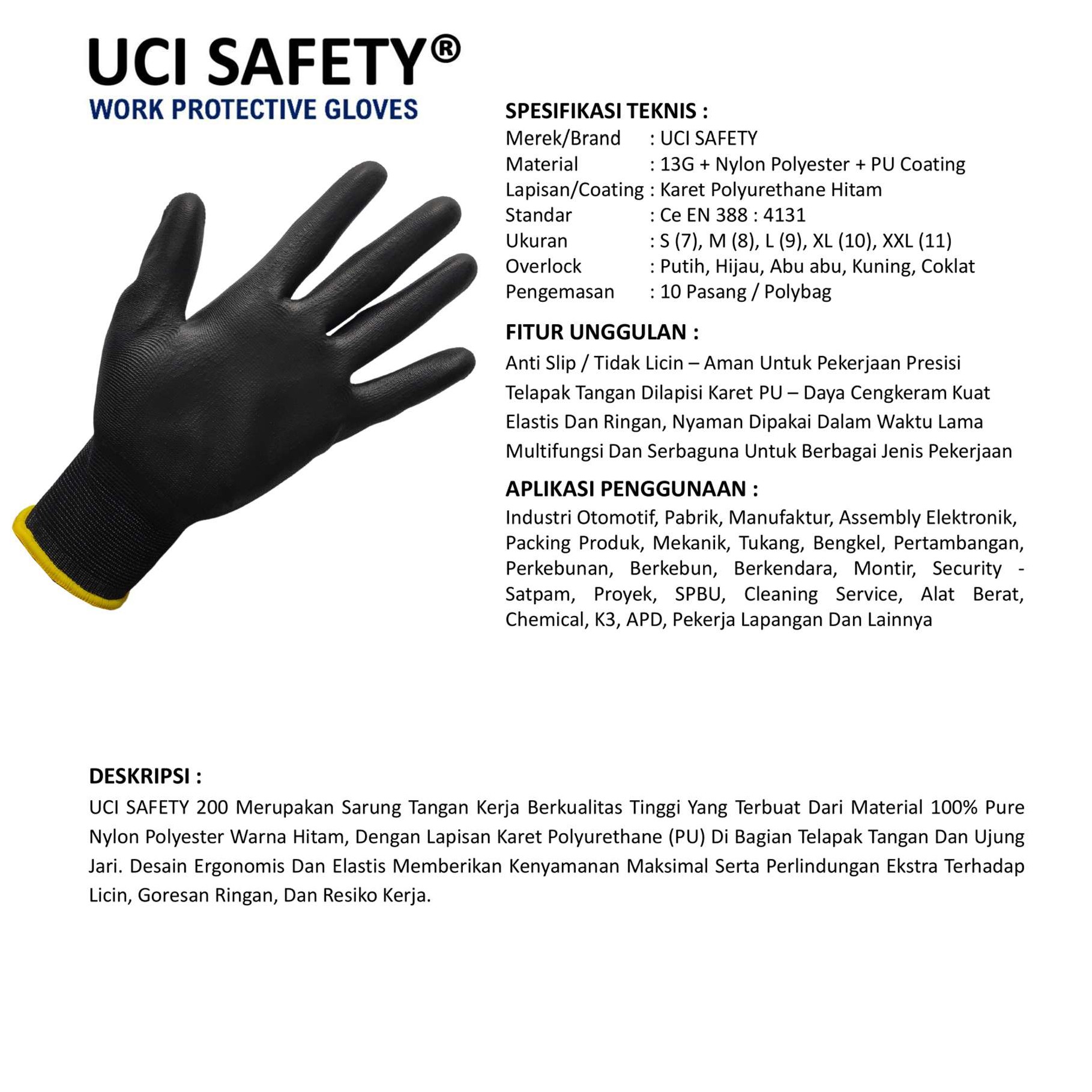 UCI SAFETY 200 Merupakan Sarung Tangan Kerja Berkualitas Tinggi Yang Terbuat Dari Material 100% Pure Nylon Polyester Warna Hitam, Dengan Lapisan Karet Polyurethane (PU) Di Bagian Telapak Tangan Dan Ujung Jari. Desain Ergonomis Dan Elastis Memberikan Kenyamanan Maksimal Serta Perlindungan Ekstra Terhadap Licin, Goresan Ringan, Dan Resiko Kerja.