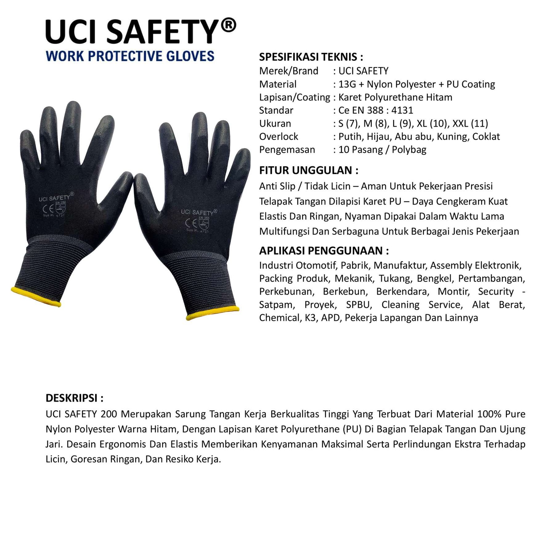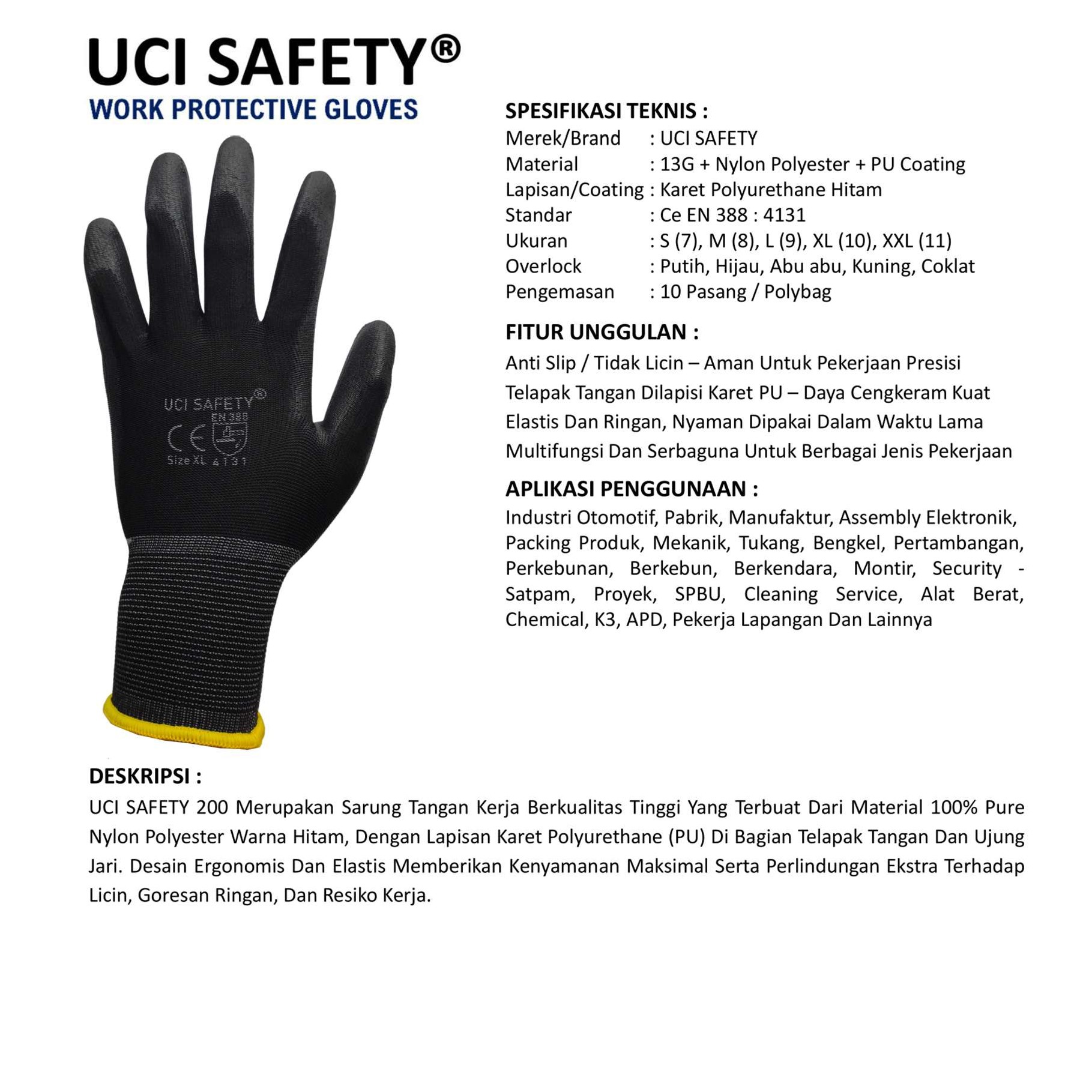 UCI SAFETY 200 Merupakan Sarung Tangan Kerja Berkualitas Tinggi Yang Terbuat Dari Material 100% Pure Nylon Polyester Warna Hitam, Dengan Lapisan Karet Polyurethane (PU) Di Bagian Telapak Tangan Dan Ujung Jari. Desain Ergonomis Dan Elastis Memberikan Kenyamanan Maksimal Serta Perlindungan Ekstra Terhadap Licin, Goresan Ringan, Dan Resiko Kerja.