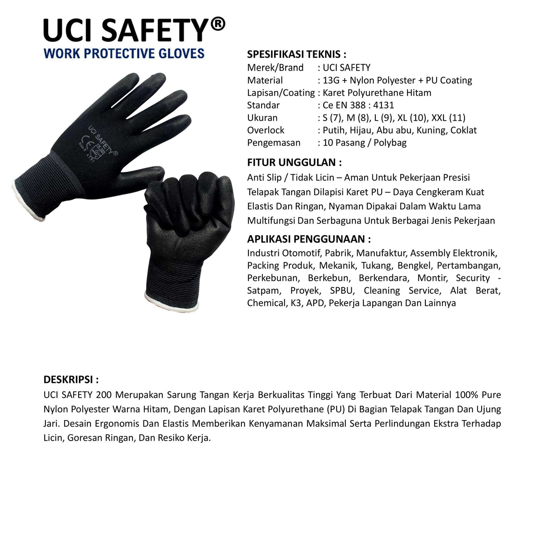 UCI SAFETY 200 Merupakan Sarung Tangan Kerja Berkualitas Tinggi Yang Terbuat Dari Material 100% Pure Nylon Polyester Warna Hitam, Dengan Lapisan Karet Polyurethane (PU) Di Bagian Telapak Tangan Dan Ujung Jari. Desain Ergonomis Dan Elastis Memberikan Kenyamanan Maksimal Serta Perlindungan Ekstra Terhadap Licin, Goresan Ringan, Dan Resiko Kerja.