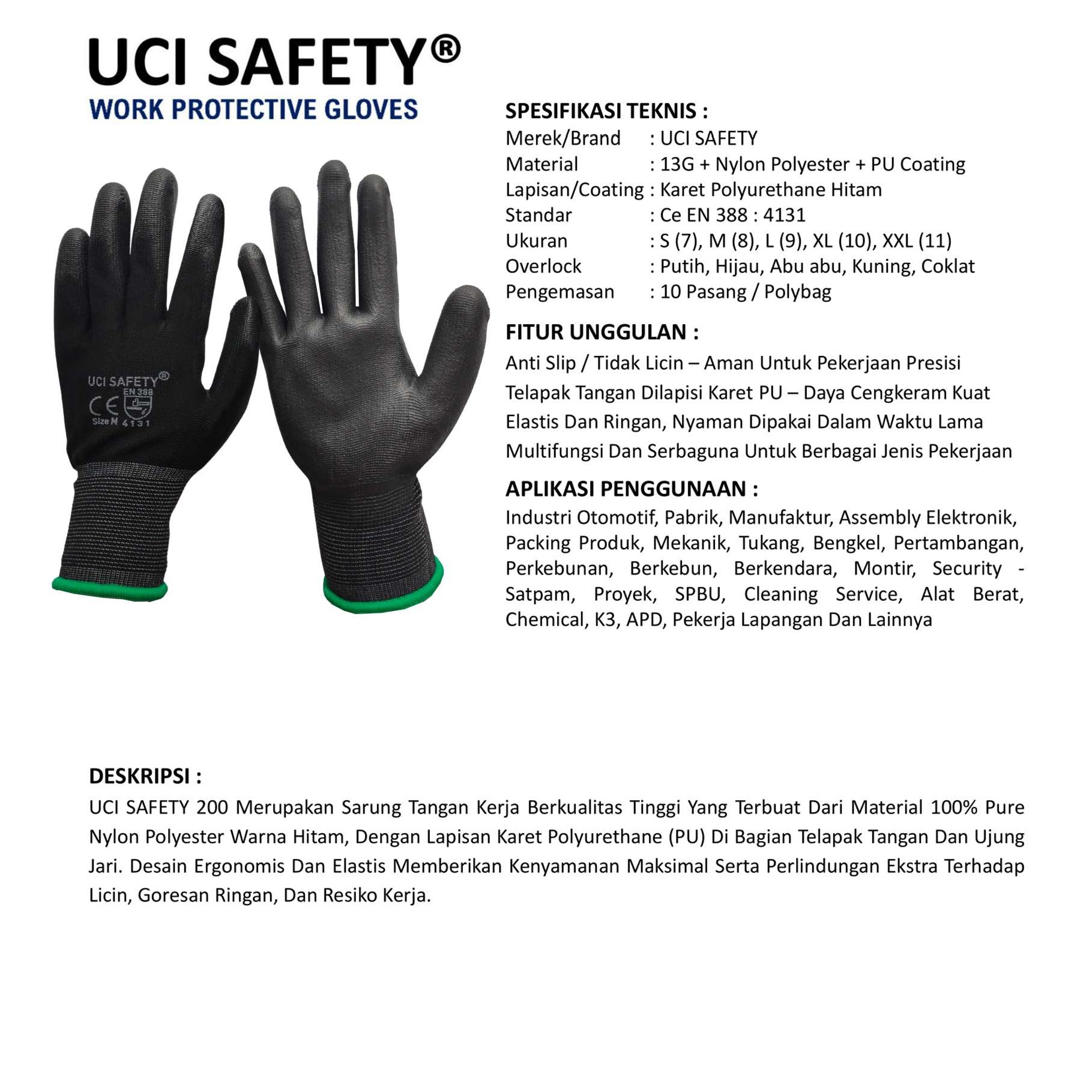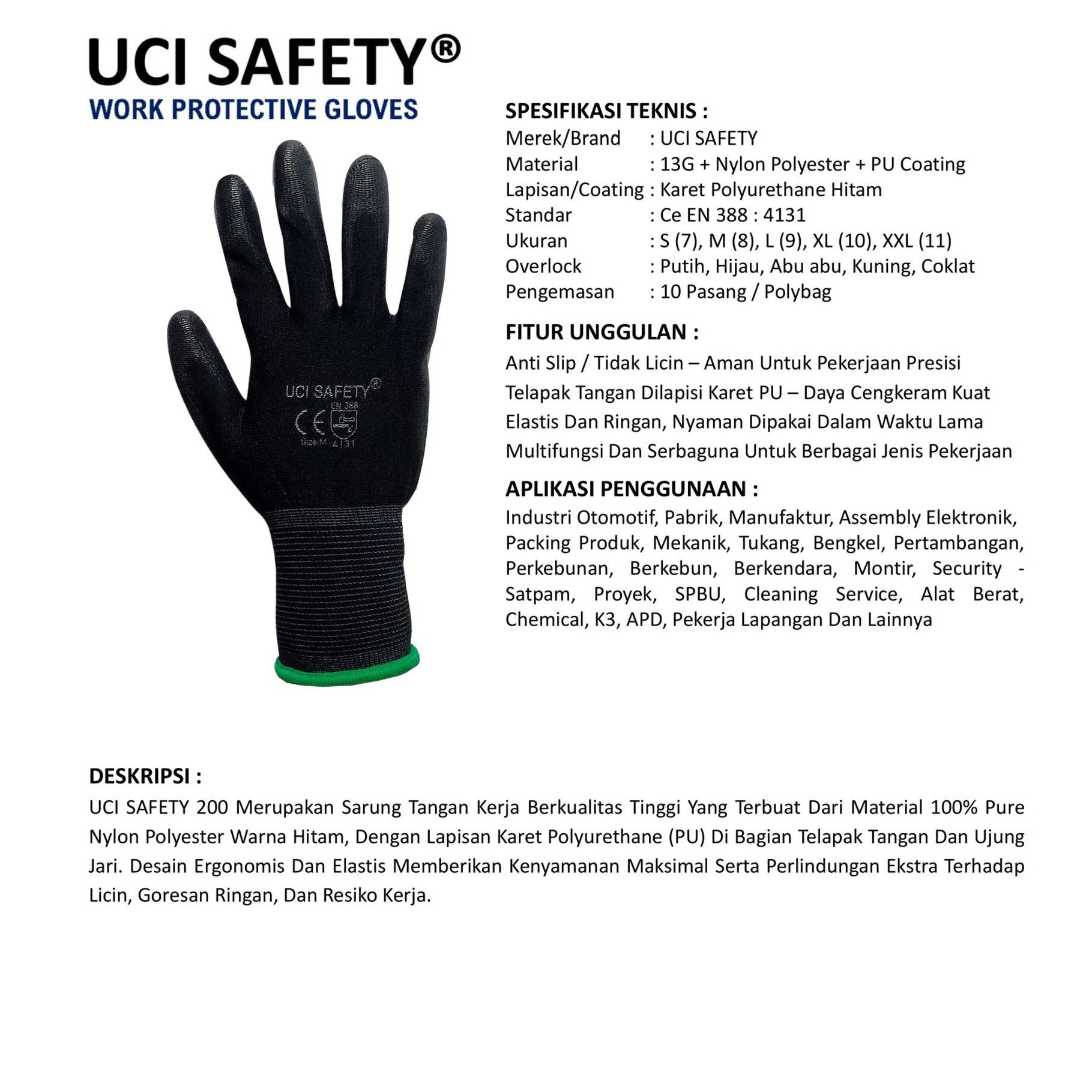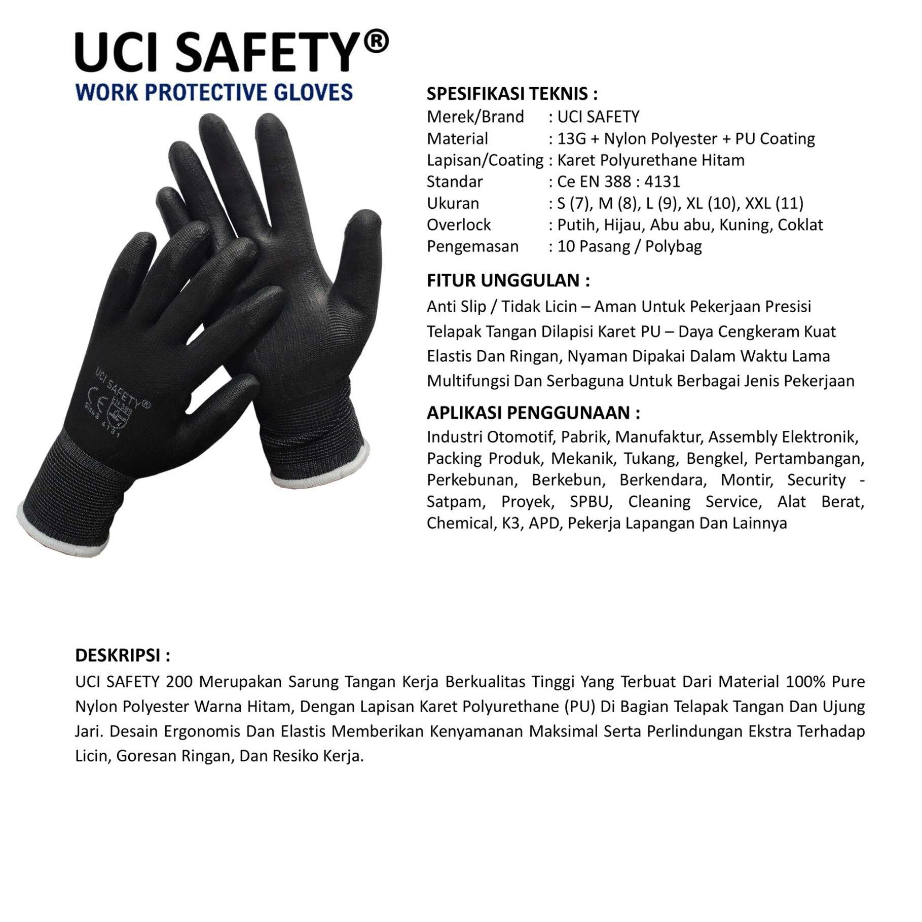 UCI SAFETY 200 Merupakan Sarung Tangan Kerja Berkualitas Tinggi Yang Terbuat Dari Material 100% Pure Nylon Polyester Warna Hitam, Dengan Lapisan Karet Polyurethane (PU) Di Bagian Telapak Tangan Dan Ujung Jari. Desain Ergonomis Dan Elastis Memberikan Kenyamanan Maksimal Serta Perlindungan Ekstra Terhadap Licin, Goresan Ringan, Dan Resiko Kerja.