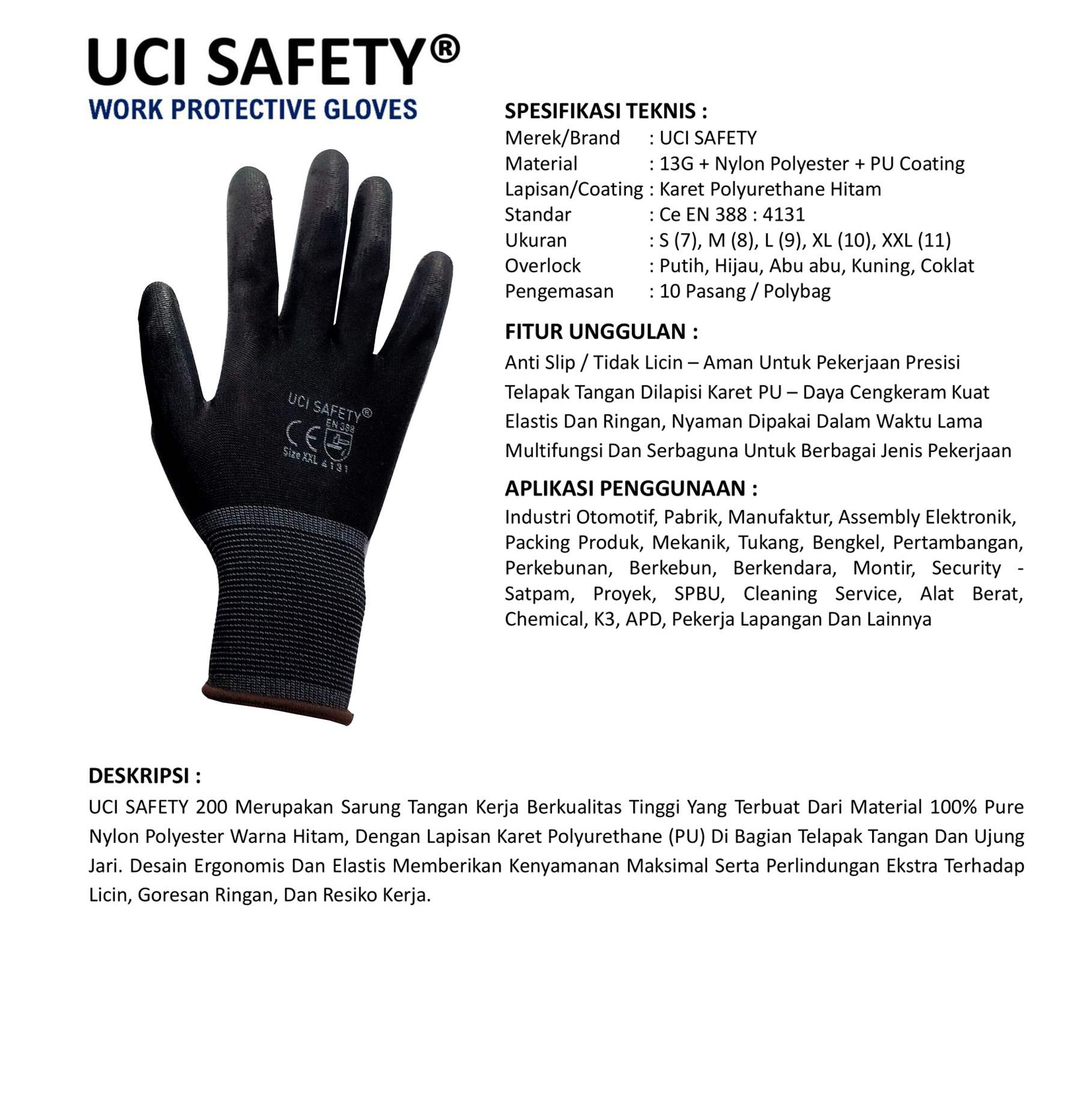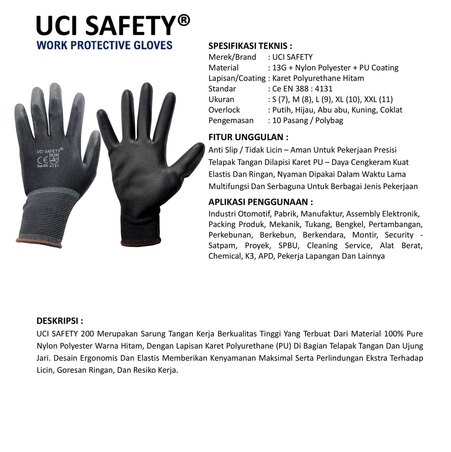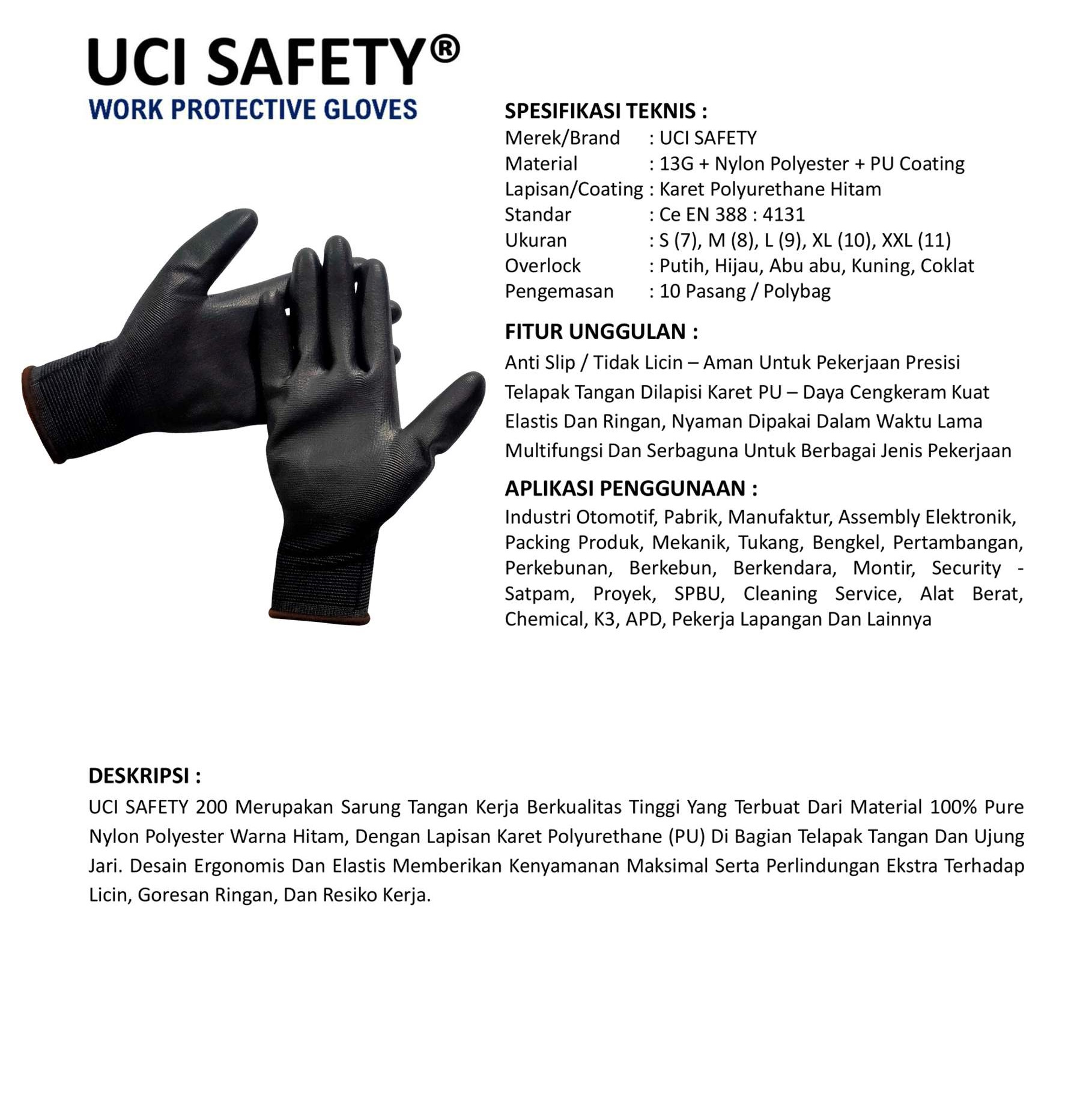 UCI SAFETY 200 Merupakan Sarung Tangan Kerja Berkualitas Tinggi Yang Terbuat Dari Material 100% Pure Nylon Polyester Warna Hitam, Dengan Lapisan Karet Polyurethane (PU) Di Bagian Telapak Tangan Dan Ujung Jari. Desain Ergonomis Dan Elastis Memberikan Kenyamanan Maksimal Serta Perlindungan Ekstra Terhadap Licin, Goresan Ringan, Dan Resiko Kerja.