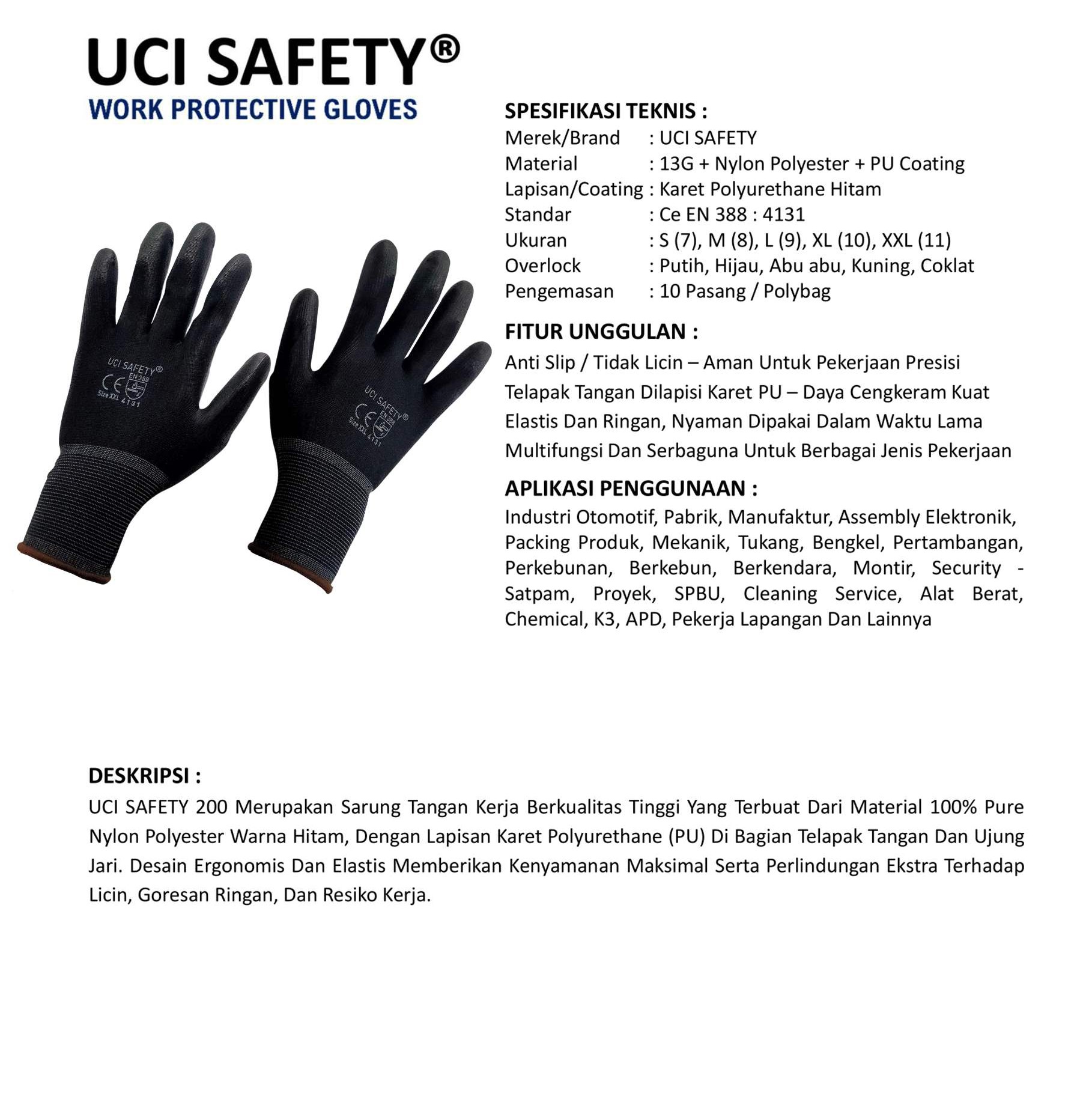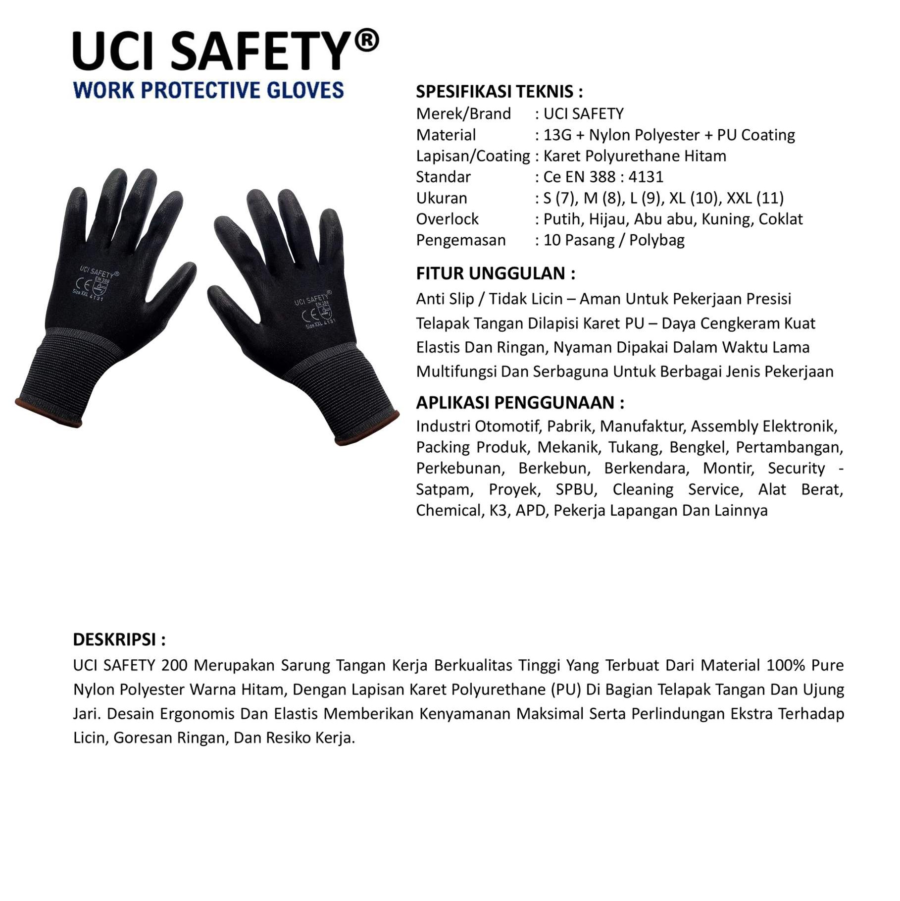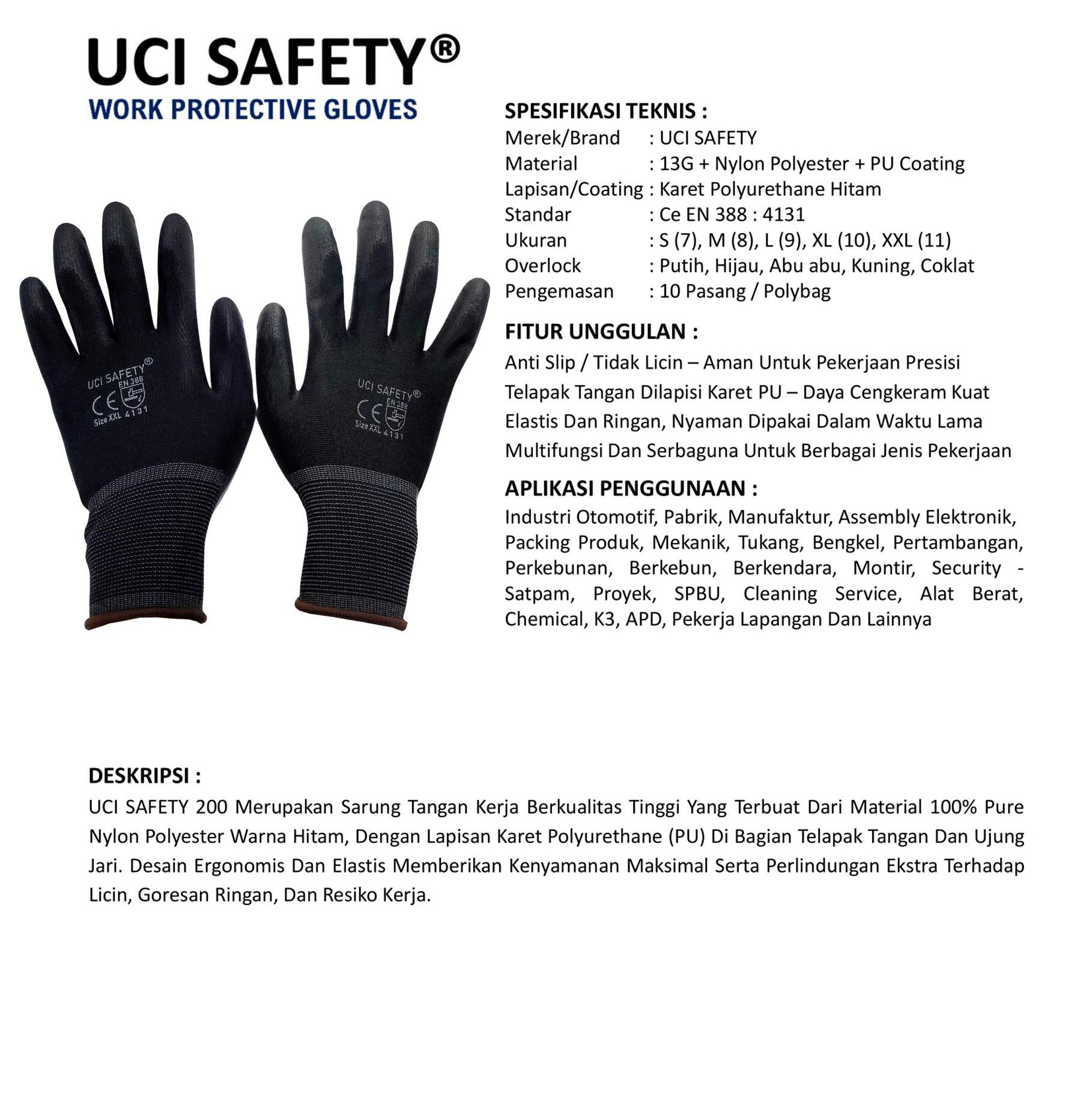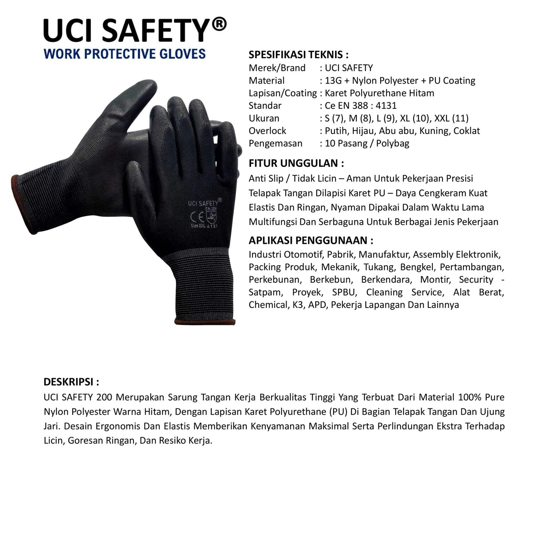 UCI SAFETY 200 Merupakan Sarung Tangan Kerja Berkualitas Tinggi Yang Terbuat Dari Material 100% Pure Nylon Polyester Warna Hitam, Dengan Lapisan Karet Polyurethane (PU) Di Bagian Telapak Tangan Dan Ujung Jari. Desain Ergonomis Dan Elastis Memberikan Kenyamanan Maksimal Serta Perlindungan Ekstra Terhadap Licin, Goresan Ringan, Dan Resiko Kerja.