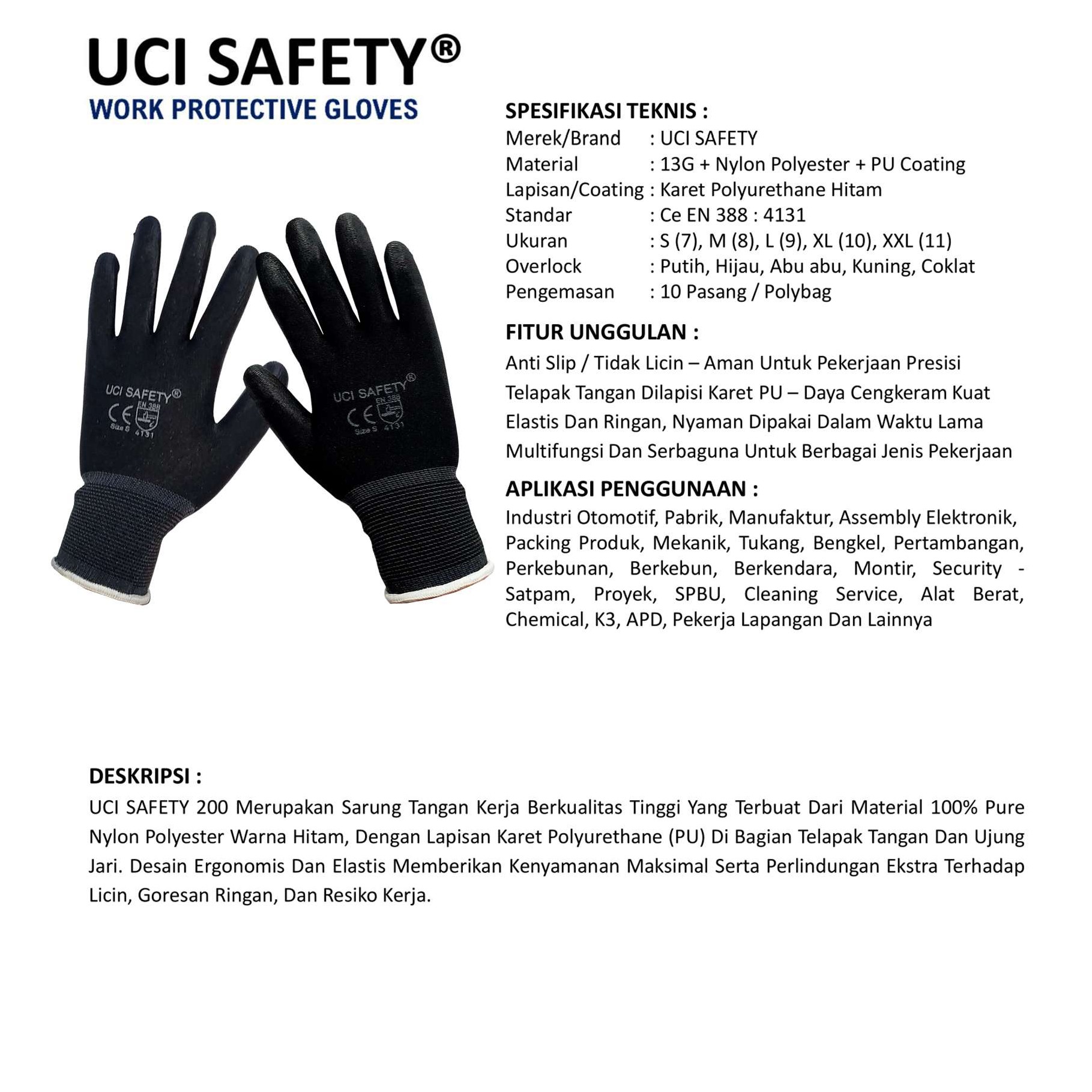 UCI SAFETY 200 Merupakan Sarung Tangan Kerja Berkualitas Tinggi Yang Terbuat Dari Material 100% Pure Nylon Polyester Warna Hitam, Dengan Lapisan Karet Polyurethane (PU) Di Bagian Telapak Tangan Dan Ujung Jari. Desain Ergonomis Dan Elastis Memberikan Kenyamanan Maksimal Serta Perlindungan Ekstra Terhadap Licin, Goresan Ringan, Dan Resiko Kerja.