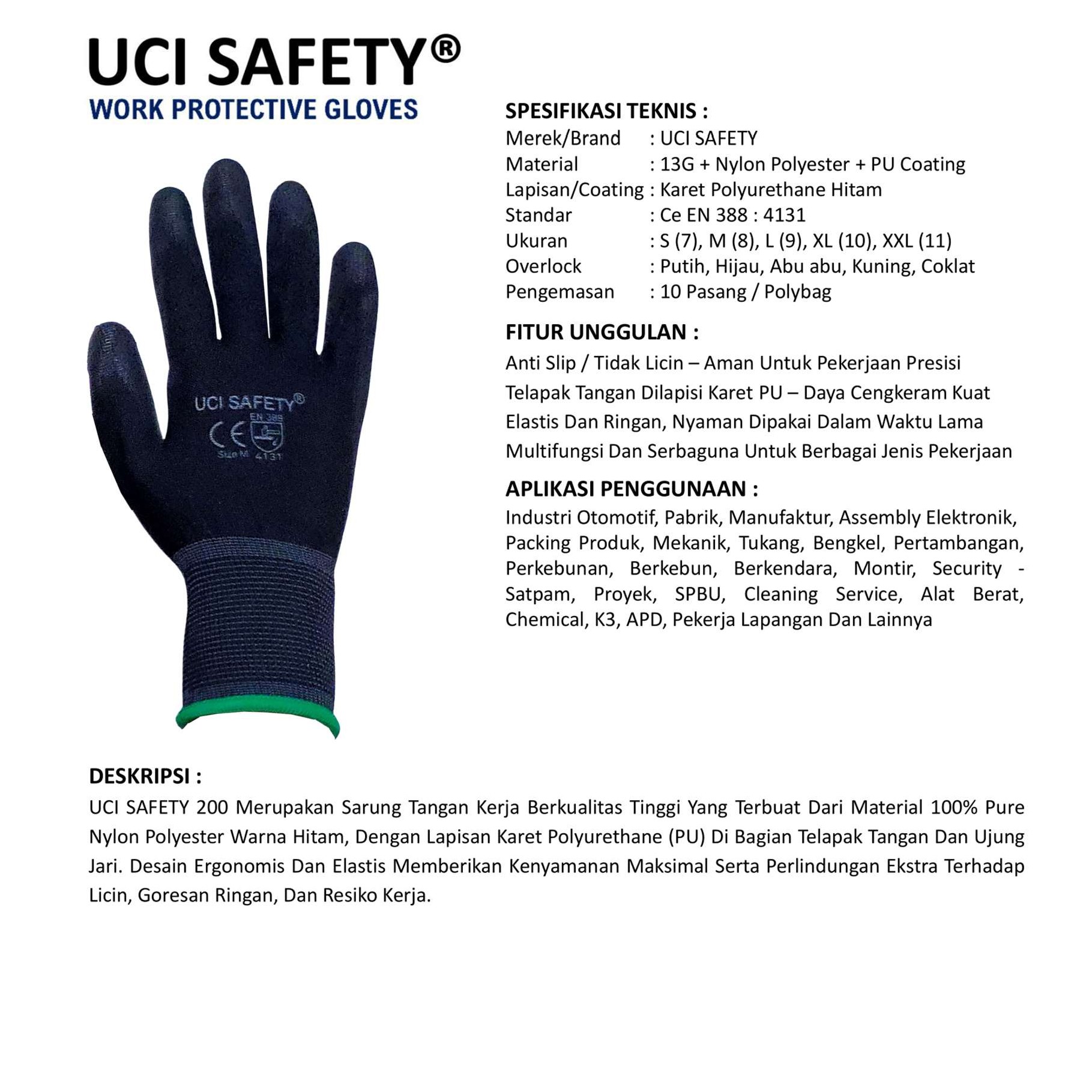 UCI SAFETY 200 Merupakan Sarung Tangan Kerja Berkualitas Tinggi Yang Terbuat Dari Material 100% Pure Nylon Polyester Warna Hitam, Dengan Lapisan Karet Polyurethane (PU) Di Bagian Telapak Tangan Dan Ujung Jari. Desain Ergonomis Dan Elastis Memberikan Kenyamanan Maksimal Serta Perlindungan Ekstra Terhadap Licin, Goresan Ringan, Dan Resiko Kerja.