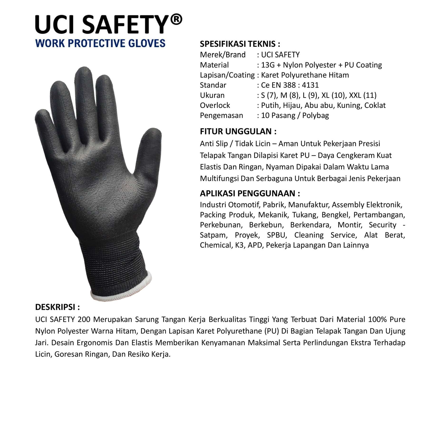 UCI SAFETY 200 Merupakan Sarung Tangan Kerja Berkualitas Tinggi Yang Terbuat Dari Material 100% Pure Nylon Polyester Warna Hitam, Dengan Lapisan Karet Polyurethane (PU) Di Bagian Telapak Tangan Dan Ujung Jari. Desain Ergonomis Dan Elastis Memberikan Kenyamanan Maksimal Serta Perlindungan Ekstra Terhadap Licin, Goresan Ringan, Dan Resiko Kerja.