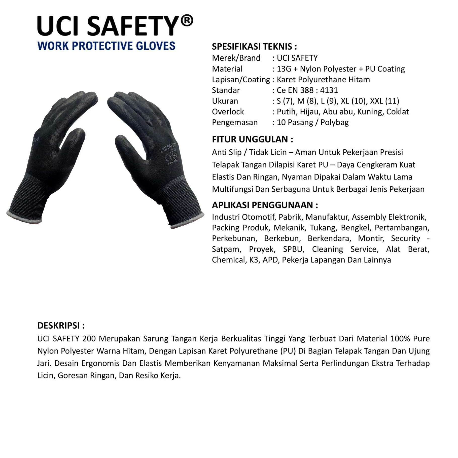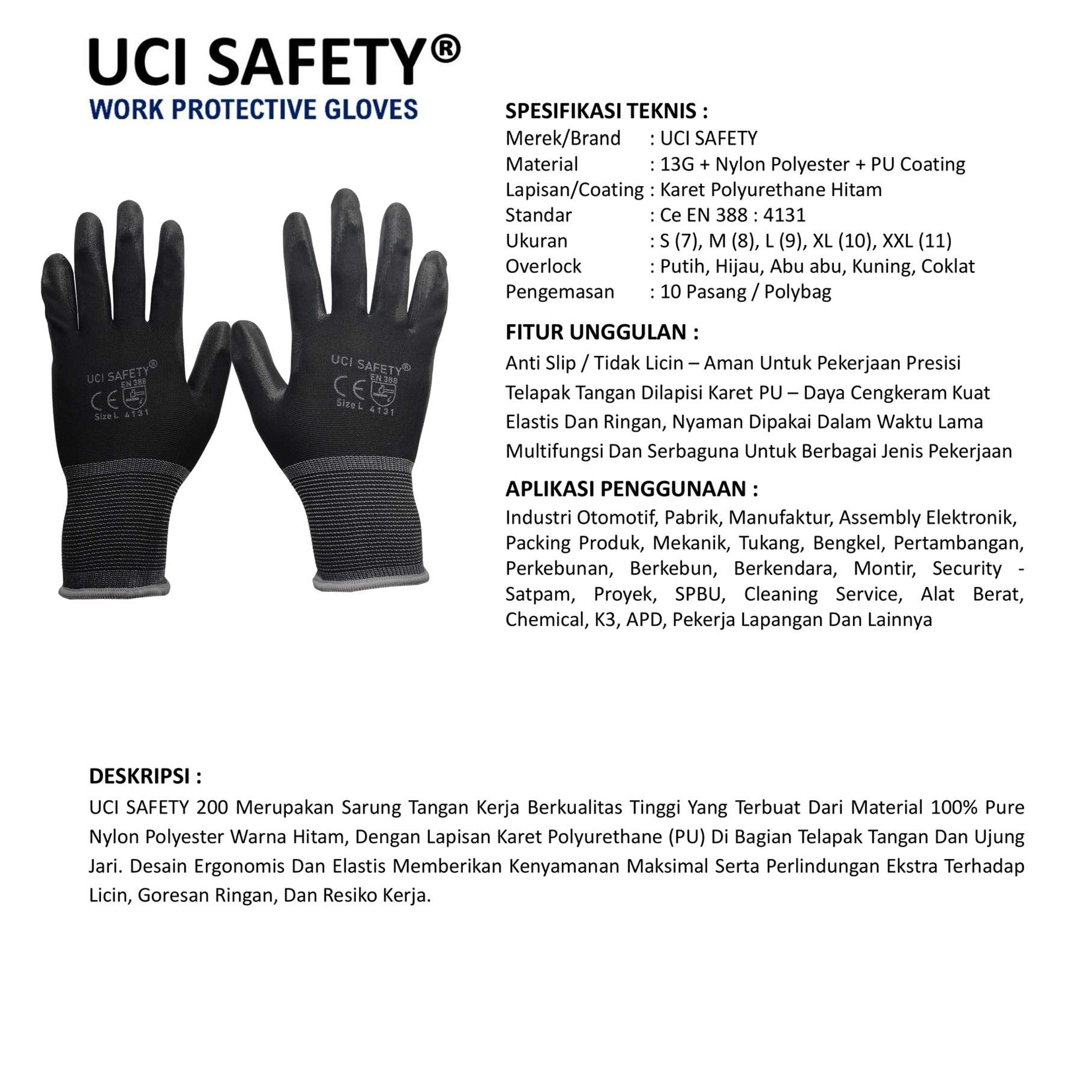 UCI SAFETY 200 Merupakan Sarung Tangan Kerja Berkualitas Tinggi Yang Terbuat Dari Material 100% Pure Nylon Polyester Warna Hitam, Dengan Lapisan Karet Polyurethane (PU) Di Bagian Telapak Tangan Dan Ujung Jari. Desain Ergonomis Dan Elastis Memberikan Kenyamanan Maksimal Serta Perlindungan Ekstra Terhadap Licin, Goresan Ringan, Dan Resiko Kerja.