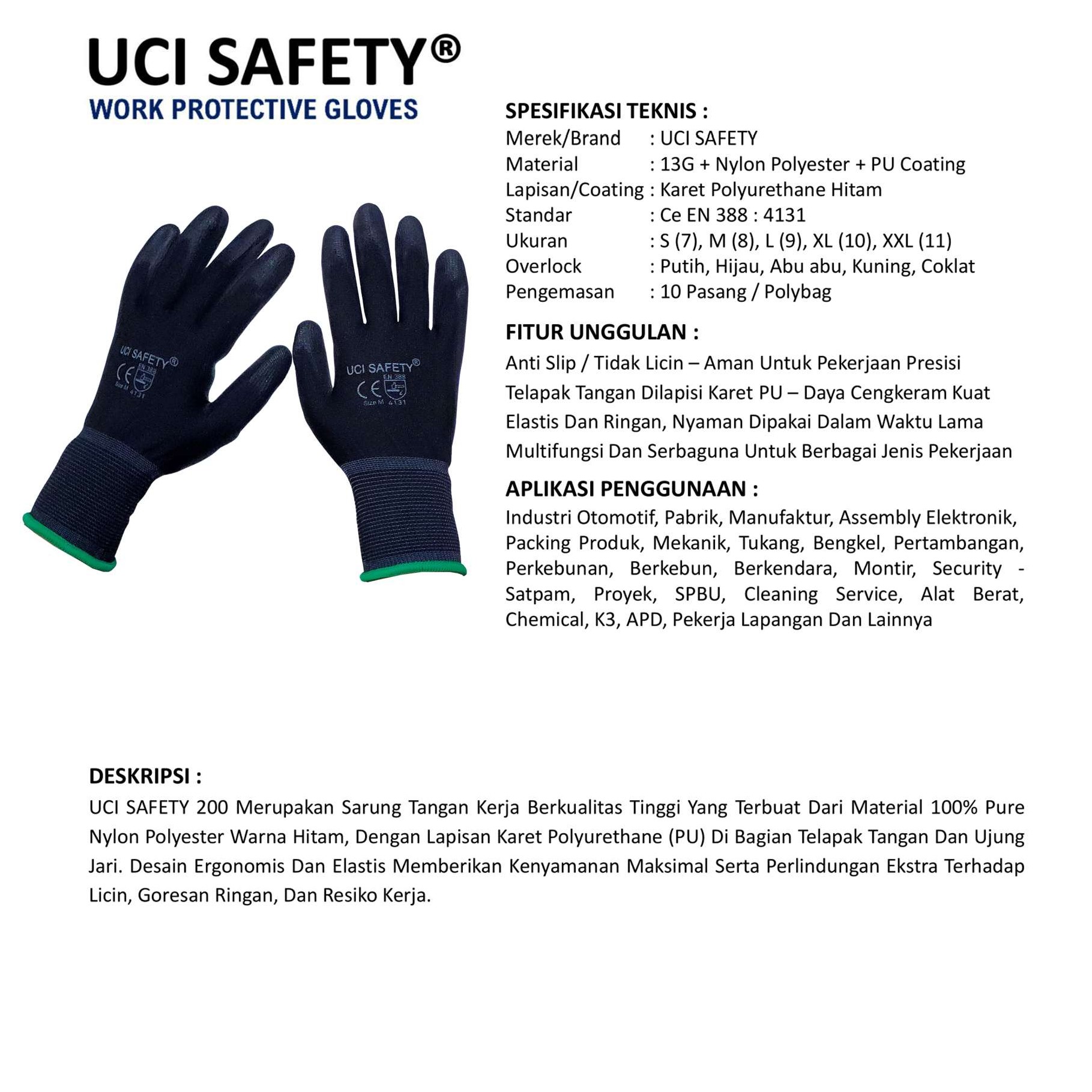 UCI SAFETY 200 Merupakan Sarung Tangan Kerja Berkualitas Tinggi Yang Terbuat Dari Material 100% Pure Nylon Polyester Warna Hitam, Dengan Lapisan Karet Polyurethane (PU) Di Bagian Telapak Tangan Dan Ujung Jari. Desain Ergonomis Dan Elastis Memberikan Kenyamanan Maksimal Serta Perlindungan Ekstra Terhadap Licin, Goresan Ringan, Dan Resiko Kerja.