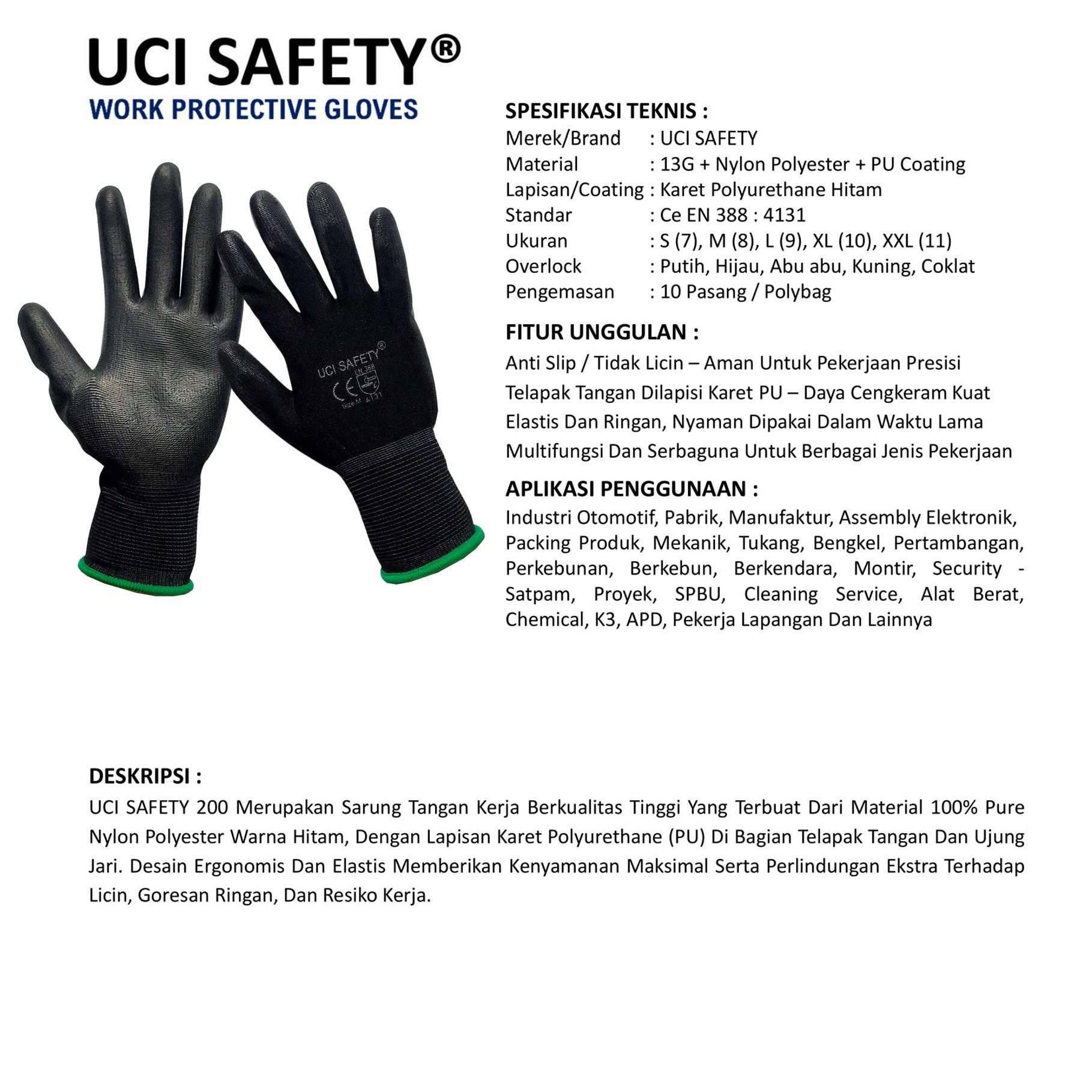 UCI SAFETY 200 Merupakan Sarung Tangan Kerja Berkualitas Tinggi Yang Terbuat Dari Material 100% Pure Nylon Polyester Warna Hitam, Dengan Lapisan Karet Polyurethane (PU) Di Bagian Telapak Tangan Dan Ujung Jari. Desain Ergonomis Dan Elastis Memberikan Kenyamanan Maksimal Serta Perlindungan Ekstra Terhadap Licin, Goresan Ringan, Dan Resiko Kerja.
