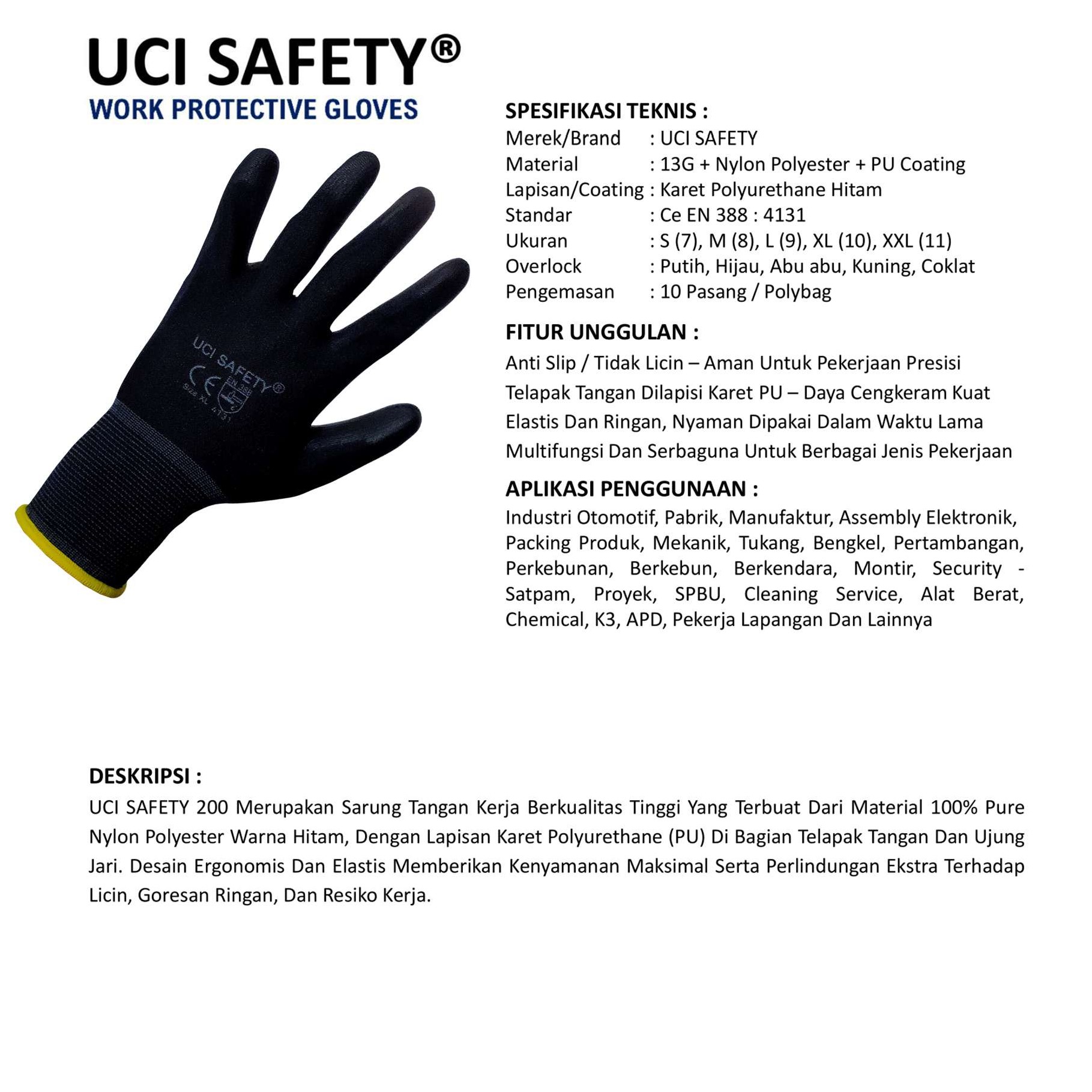 UCI SAFETY 200 Merupakan Sarung Tangan Kerja Berkualitas Tinggi Yang Terbuat Dari Material 100% Pure Nylon Polyester Warna Hitam, Dengan Lapisan Karet Polyurethane (PU) Di Bagian Telapak Tangan Dan Ujung Jari. Desain Ergonomis Dan Elastis Memberikan Kenyamanan Maksimal Serta Perlindungan Ekstra Terhadap Licin, Goresan Ringan, Dan Resiko Kerja.