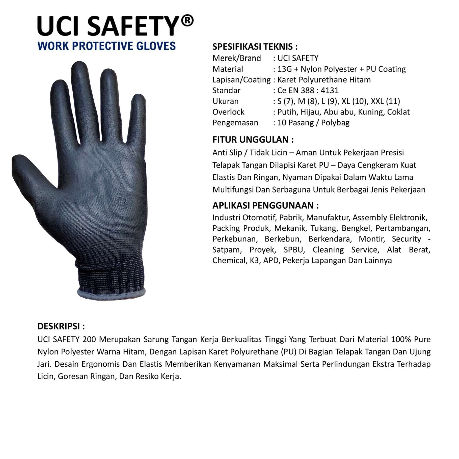 UCI SAFETY 200 Merupakan Sarung Tangan Kerja Berkualitas Tinggi Yang Terbuat Dari Material 100% Pure Nylon Polyester Warna Hitam, Dengan Lapisan Karet Polyurethane (PU) Di Bagian Telapak Tangan Dan Ujung Jari. Desain Ergonomis Dan Elastis Memberikan Kenyamanan Maksimal Serta Perlindungan Ekstra Terhadap Licin, Goresan Ringan, Dan Resiko Kerja.