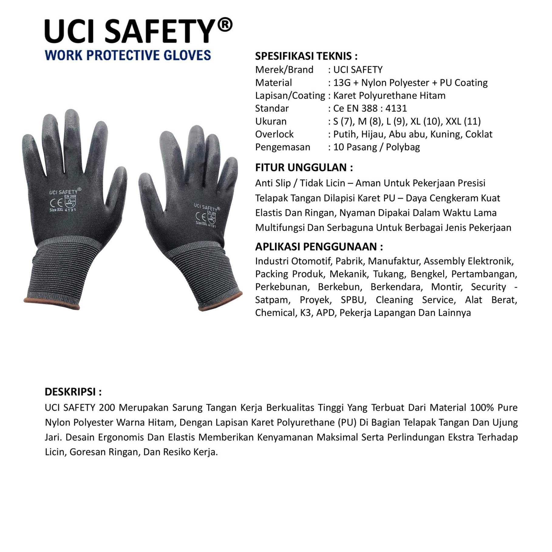 UCI SAFETY 200 Merupakan Sarung Tangan Kerja Berkualitas Tinggi Yang Terbuat Dari Material 100% Pure Nylon Polyester Warna Hitam, Dengan Lapisan Karet Polyurethane (PU) Di Bagian Telapak Tangan Dan Ujung Jari. Desain Ergonomis Dan Elastis Memberikan Kenyamanan Maksimal Serta Perlindungan Ekstra Terhadap Licin, Goresan Ringan, Dan Resiko Kerja.