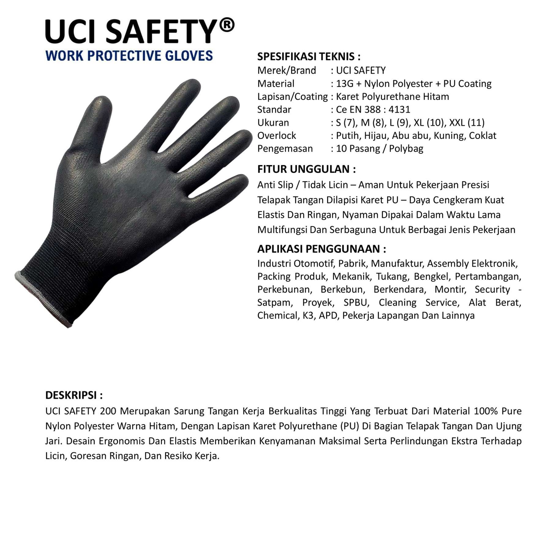 UCI SAFETY 200 Merupakan Sarung Tangan Kerja Berkualitas Tinggi Yang Terbuat Dari Material 100% Pure Nylon Polyester Warna Hitam, Dengan Lapisan Karet Polyurethane (PU) Di Bagian Telapak Tangan Dan Ujung Jari. Desain Ergonomis Dan Elastis Memberikan Kenyamanan Maksimal Serta Perlindungan Ekstra Terhadap Licin, Goresan Ringan, Dan Resiko Kerja.
