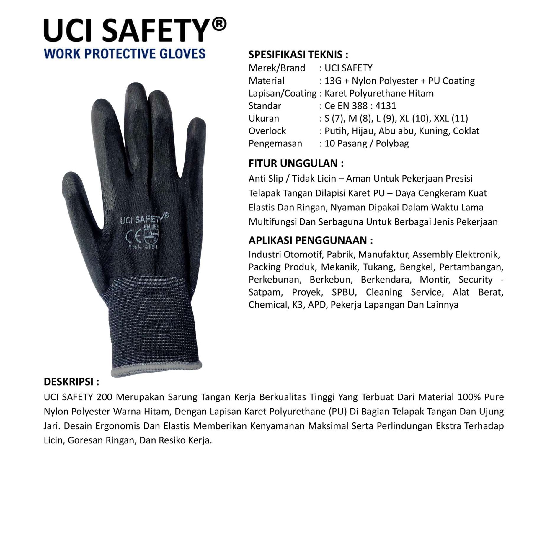 UCI SAFETY 200 Merupakan Sarung Tangan Kerja Berkualitas Tinggi Yang Terbuat Dari Material 100% Pure Nylon Polyester Warna Hitam, Dengan Lapisan Karet Polyurethane (PU) Di Bagian Telapak Tangan Dan Ujung Jari. Desain Ergonomis Dan Elastis Memberikan Kenyamanan Maksimal Serta Perlindungan Ekstra Terhadap Licin, Goresan Ringan, Dan Resiko Kerja.