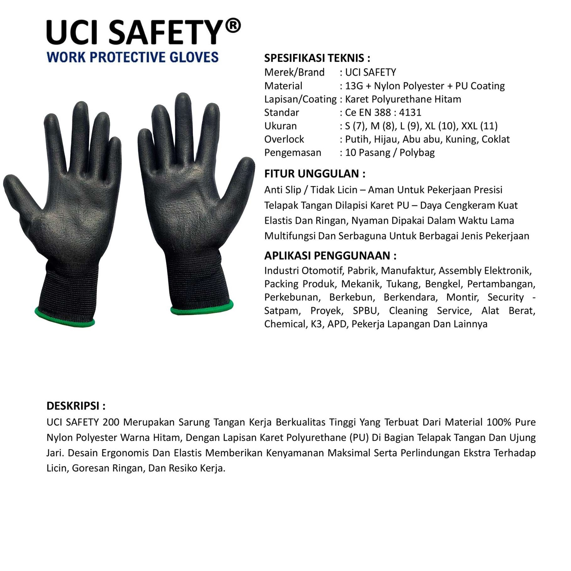 UCI SAFETY 200 Merupakan Sarung Tangan Kerja Berkualitas Tinggi Yang Terbuat Dari Material 100% Pure Nylon Polyester Warna Hitam, Dengan Lapisan Karet Polyurethane (PU) Di Bagian Telapak Tangan Dan Ujung Jari. Desain Ergonomis Dan Elastis Memberikan Kenyamanan Maksimal Serta Perlindungan Ekstra Terhadap Licin, Goresan Ringan, Dan Resiko Kerja.